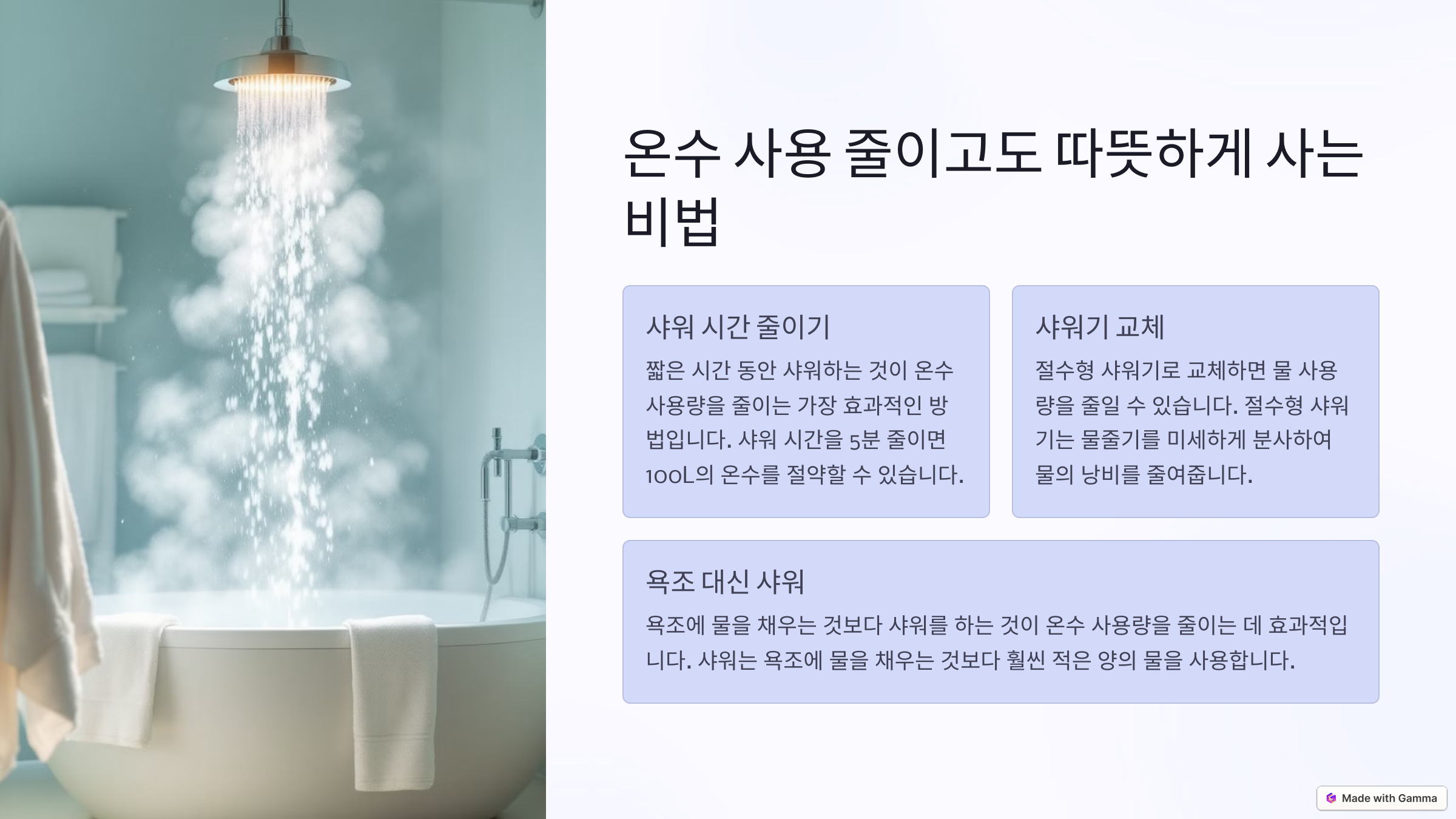 샤워 시간 줄이기 | 월 20% 이상 절약 | 5분 이내로 샤워 시간 단축 |