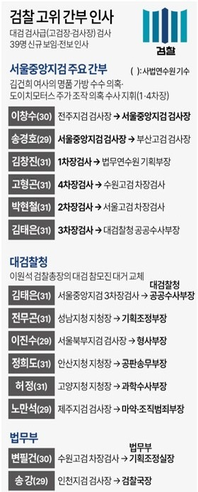 법무부는 13일 대검 검사급(고검장·검사장) 검사 39명(신규 보임 12명, 전보 27명)에 대한 인사를 단행했습니다.부임 일자는 오는 16일입니다.