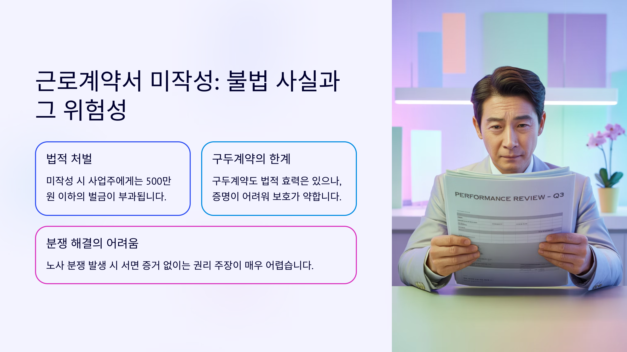 이런 경우 임금 체불이나 부당해고, 휴게시간 미제공 등 다양한 불이익을 받을 수 있는데, 근로계약서가 없으면 이를 증명하기가 매우 어렵답니다. 결국 노동자가 손해를 보게 되는 상황이 자주 발생해요.