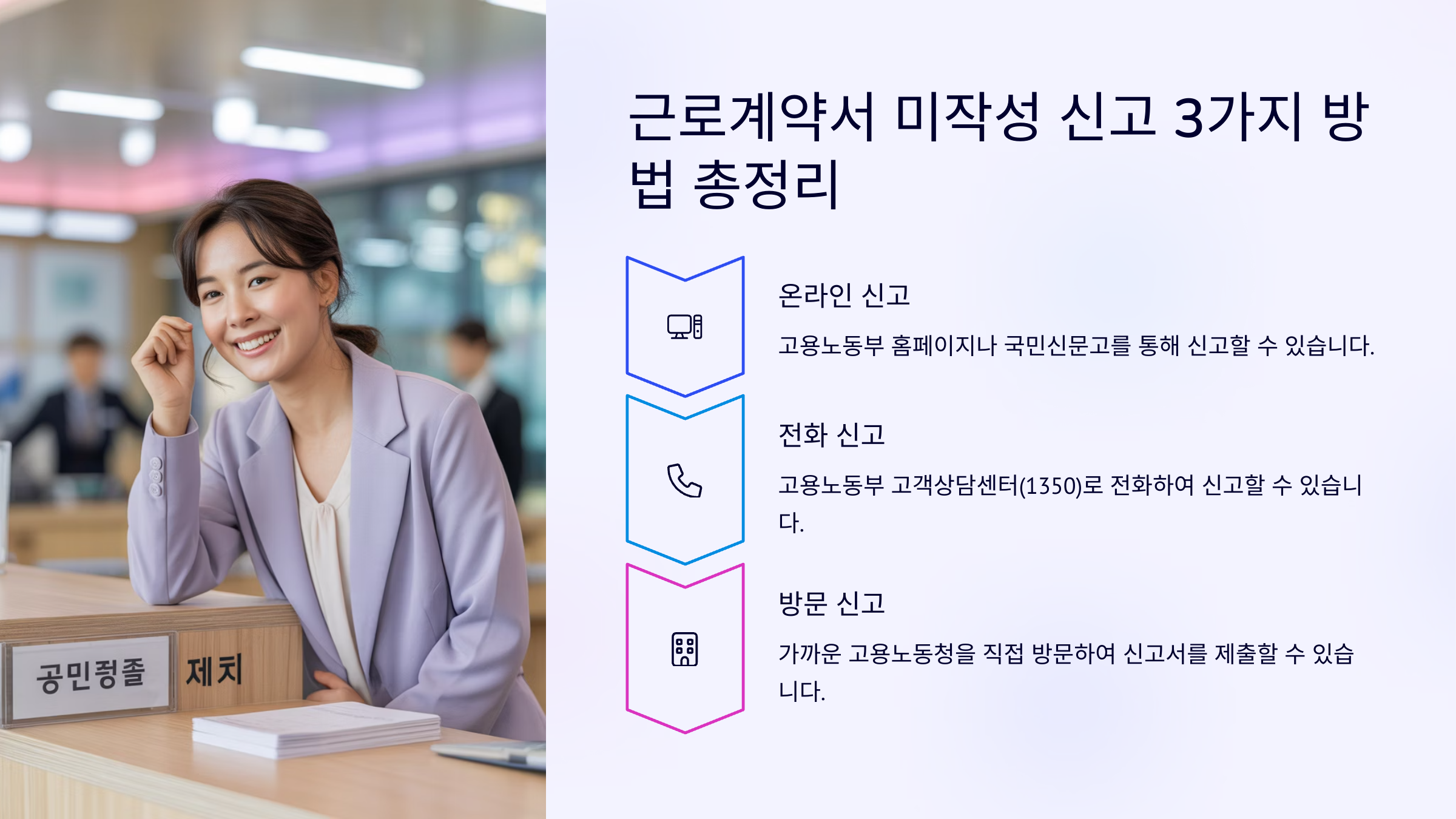 2. 고용노동부 고객상담센터 (국번없이 1350): 상담과 동시에 신고도 가능하고, 관련 자료 준비에 대한 안내도 받을 수 있어요. 친절하게 안내해 줘서 처음 신고하는 분들도 어렵지 않아요.