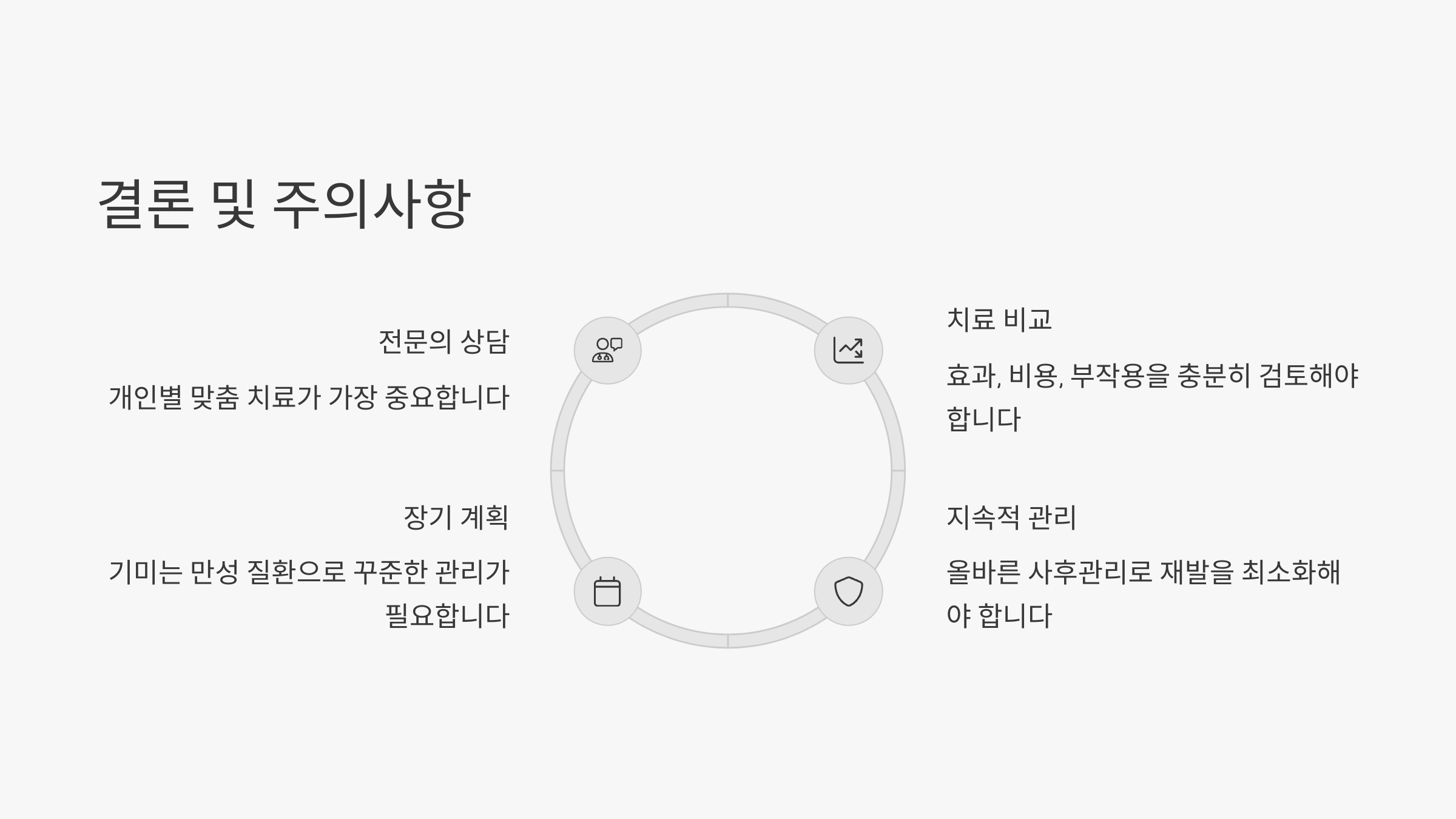 A2. 기미는 완치보다는 관리 개념이 강해요. 치료 후에도 자외선 차단 등 꾸준한 관리가 필요해요.