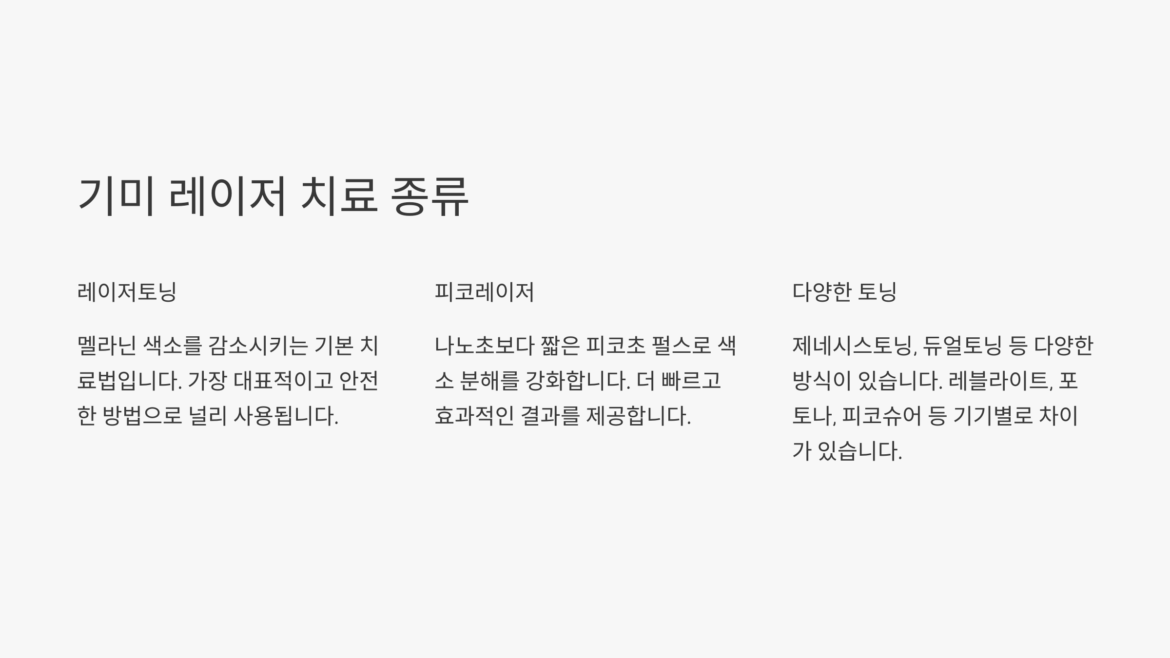 기미에 대해 정확히 알고 나면 치료 선택지도 넓어져요. 다음 섹션에서는 다양한 기미 레이저 치료의 종류에 대해 알려드릴게요!