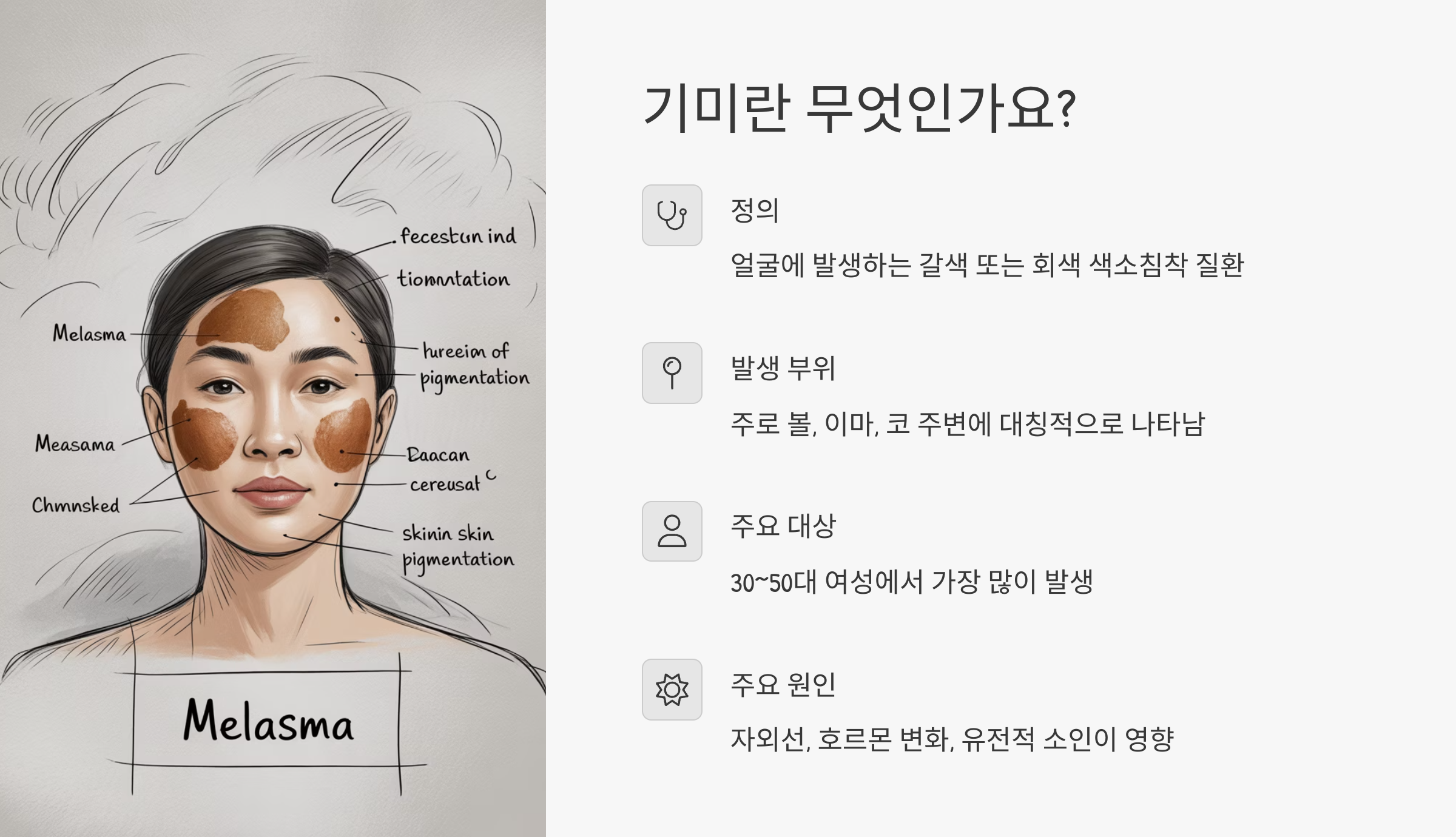 기미는 얼굴에 갈색 또는 회갈색의 얼룩처럼 나타나는 색소침착 질환이에요. 주로 광대, 이마, 턱 라인에 생기고, 자외선 노출, 호르몬 변화, 유전 등 다양한 원인으로 발생해요.
