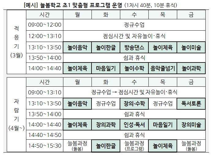 올해 1학기 2,000개교 이상, 2학기 모든 초등학교에서 늘봄학교를 이용하는 1학년에게 맞춤형 프로그램을 매일 2시간 무료로 제공합니다. 초등학교 1학년 성장·발달 단계와 학부모 수요 등을 고려하여 재미있고 다양한 프로그램을 제공할 계획입니다.
