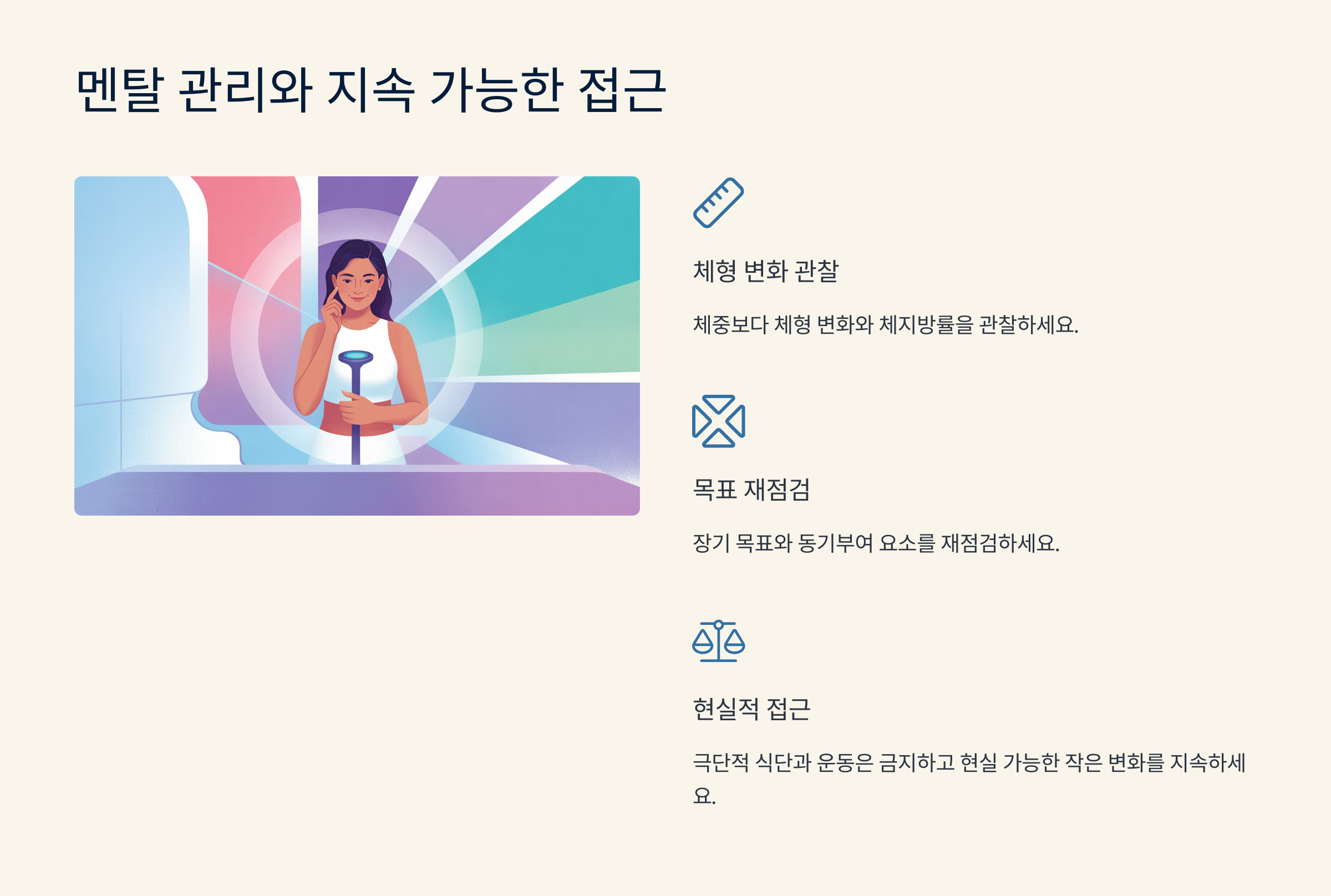 목표 설정을 현실적으로 조정하는 것도 필요해요. 처음에는 일주일에 1-2kg씩 빠지던 체중이 정체기에는 한 달에 1-2kg 정도만 빠질 수도 있어요. 이는 정상적인 현상이고, 오히려 건강한 체중 감량 속도라고 볼 수 있어요. 급격한 체중 감량보다는 꾸준하고 지속 가능한 변화를 목표로 하는 것이 장기적으로 더 성공적이에요. 체중 외에도 체지방률, 근육량, 허리둘레, 체력 향상 등 다양한 지표를 활용해서 진전을 측정하는 것이 좋아요.