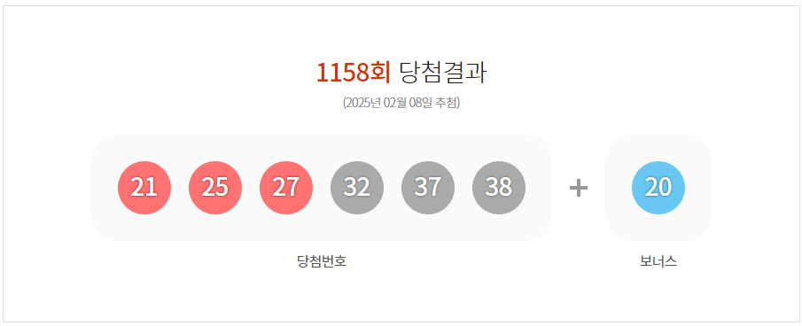 1158회 로또 당첨번호 조회 결과, 로또 복권 운영사 동행복권은 로또 복권 추첨에서 '21, 25, 27, 32, 37, 38' 이 로또 1등 당첨번호로 뽑혔다고 밝혔습니다.