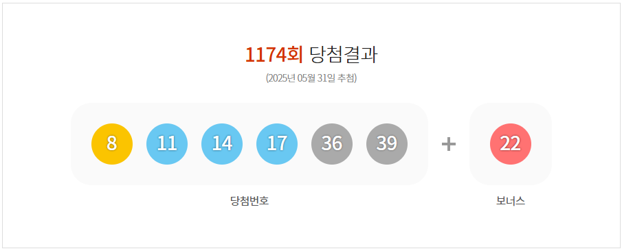 로또복권 운영사 동행복권은 제1174회 로또복권 추첨에서 '8, 11, 14, 17, 36, 39'가 1등 당첨번호로 뽑혔다고 31일 밝혔습니다. 2등 보너스 번호는 '22'입니다.