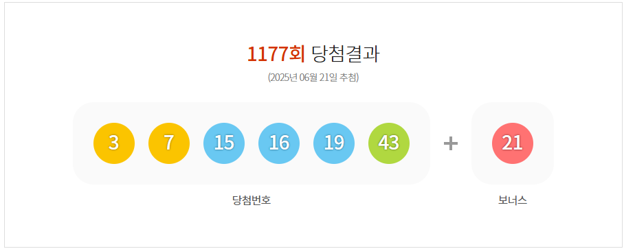 1177회 로또 당첨번호 5개와 보너스 번호 '21' 일치한 2등은 75게임으로 각각 6102만원을 받습니다. 3등인 5개 맞힌 이들은 3111게임으로 각각 147만원씩 받습니다.