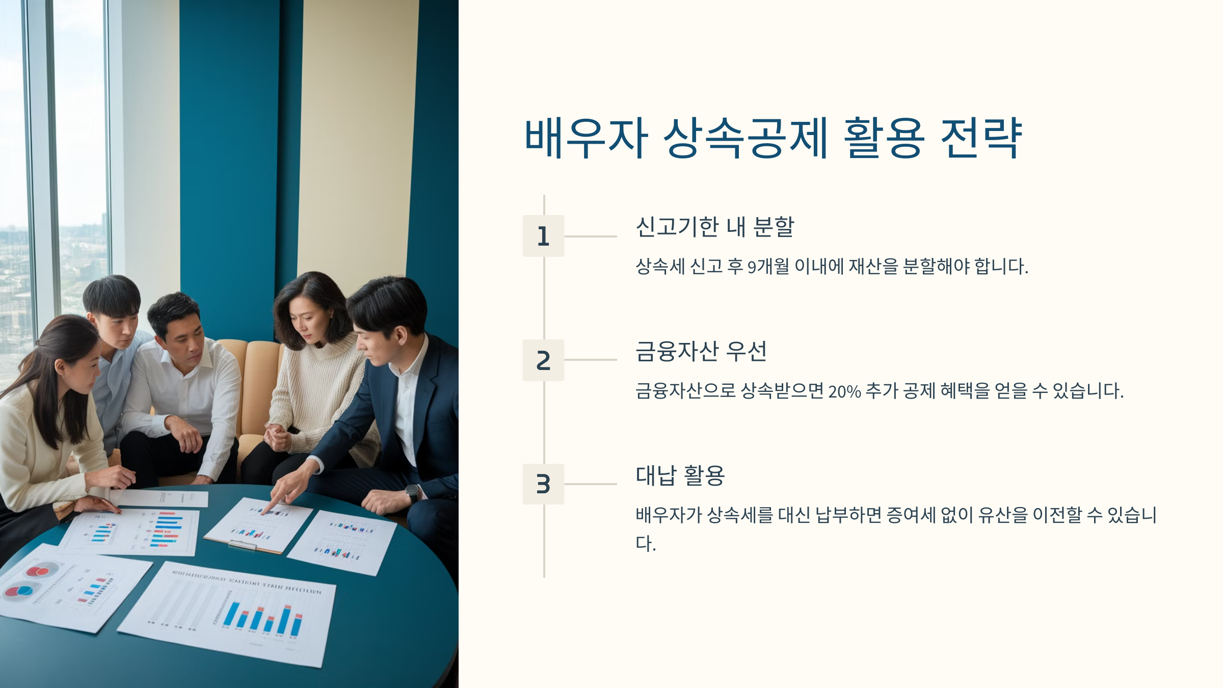 이처럼 배우자 상속세를 줄이려면 미리 증여나 재산 분할을 계획하는 것이 중요해요. 전문가와 상담을 통해 가장 적절한 절세 전략을 세우는 것이 좋아요!