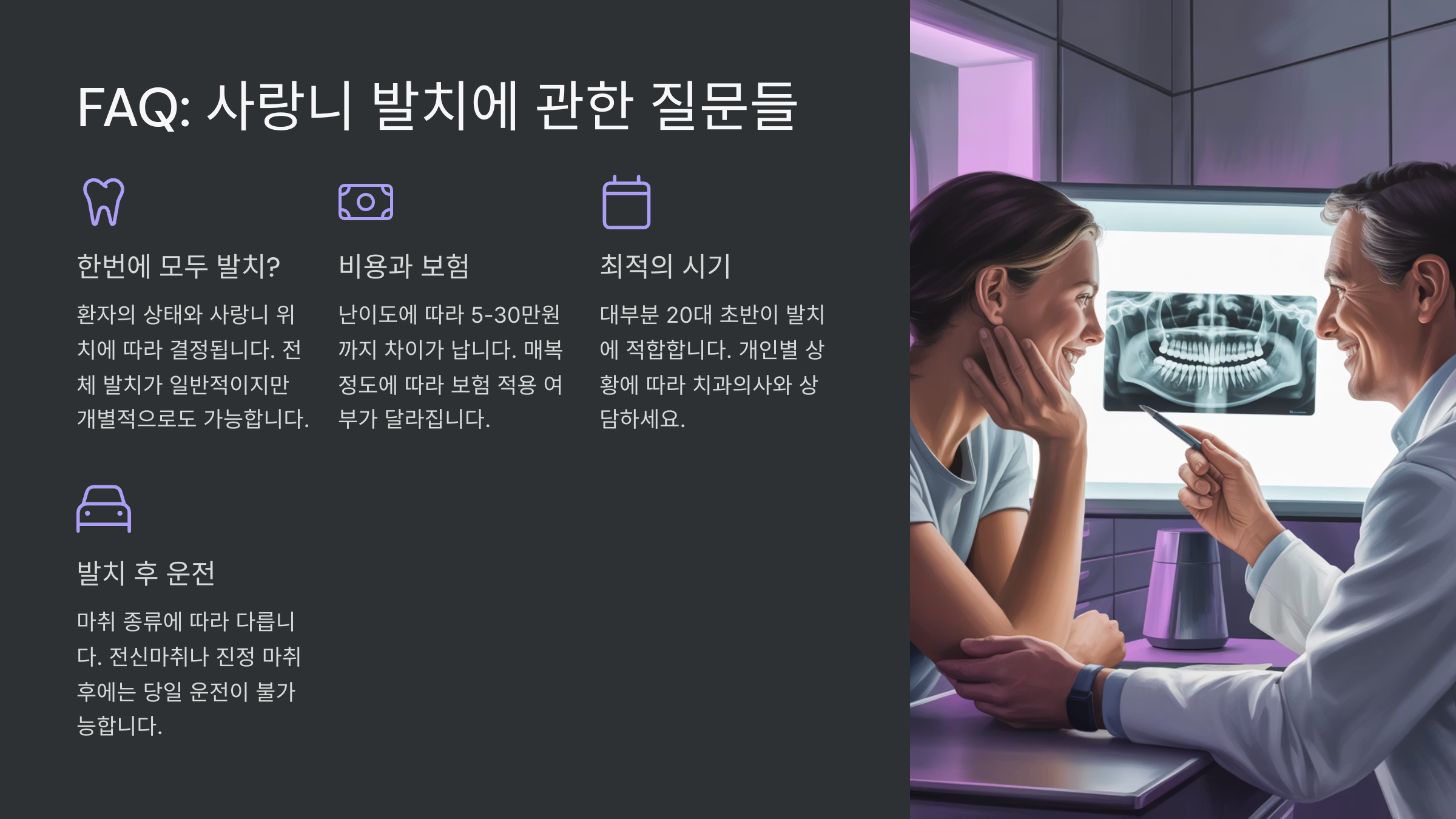 문제가 발생했을 때는 인터넷보다는 치과의 조언을 따르는 것이 가장 정확하고 안전합니다. 다음은 많은 분들이 궁금해하시는 사랑니 발치 후 관련 질문을 모은 FAQ 섹션이에요!