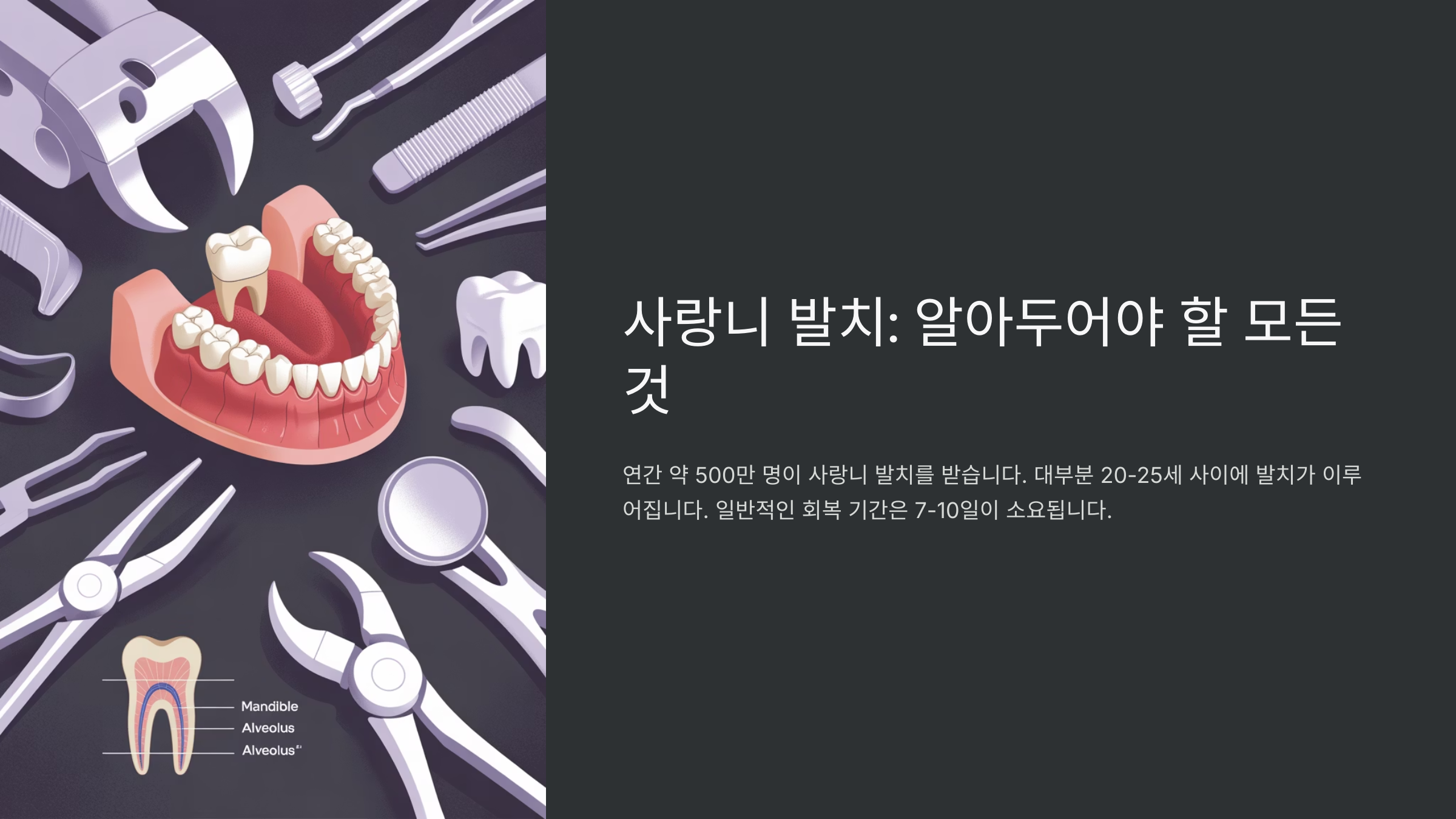 사랑니 발치는 단순한 치아 치료처럼 보일 수 있지만, 실제로는 뼈에 가깝게 자리한 부위를 수술적으로 제거하는 경우도 있어 신중한 관리가 필요합니다. 저 역시 예전에 사랑니를 발치한 후 꽤 오랜 시간 동안 통증과 부기 때문에 고생했던 기억이 있어서, 이 시기를 겪는 분들의 어려움이 진심으로 공감되었습니다.
