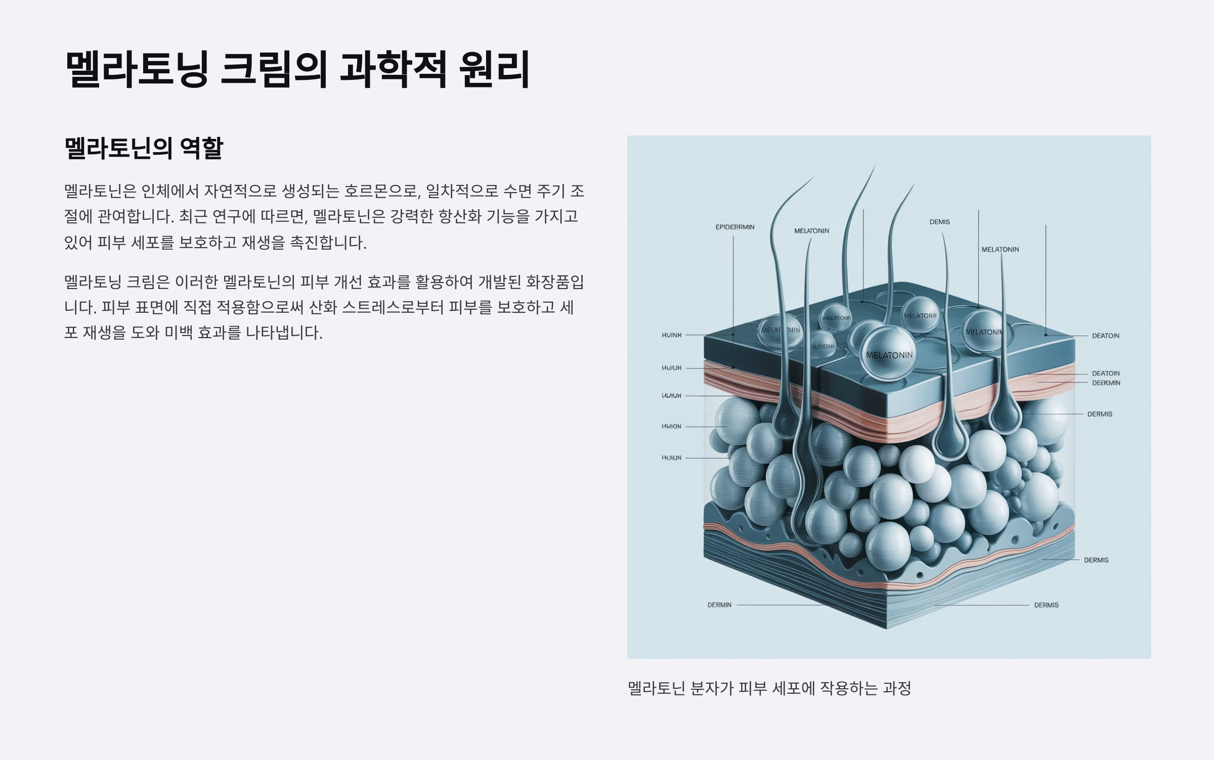 피부과학 연구에 따르면, 멜라토닝 크림의 주요 성분들은 피부 깊숙이 침투하여 멜라노사이트(멜라닌 생성 세포)에 직접 작용해요. 이는 표면적인 미백이 아닌 근본적인 개선을 가능하게 한답니다. 특히 나이아신아마이드, 알부틴, 비타민 C 유도체 같은 성분들이 시너지 효과를 내면서 더욱 강력한 효과를 보여줘요. 임상 실험에서는 8주 사용 시 색소침착이 평균 40% 감소하는 결과를 보였다고 해요!