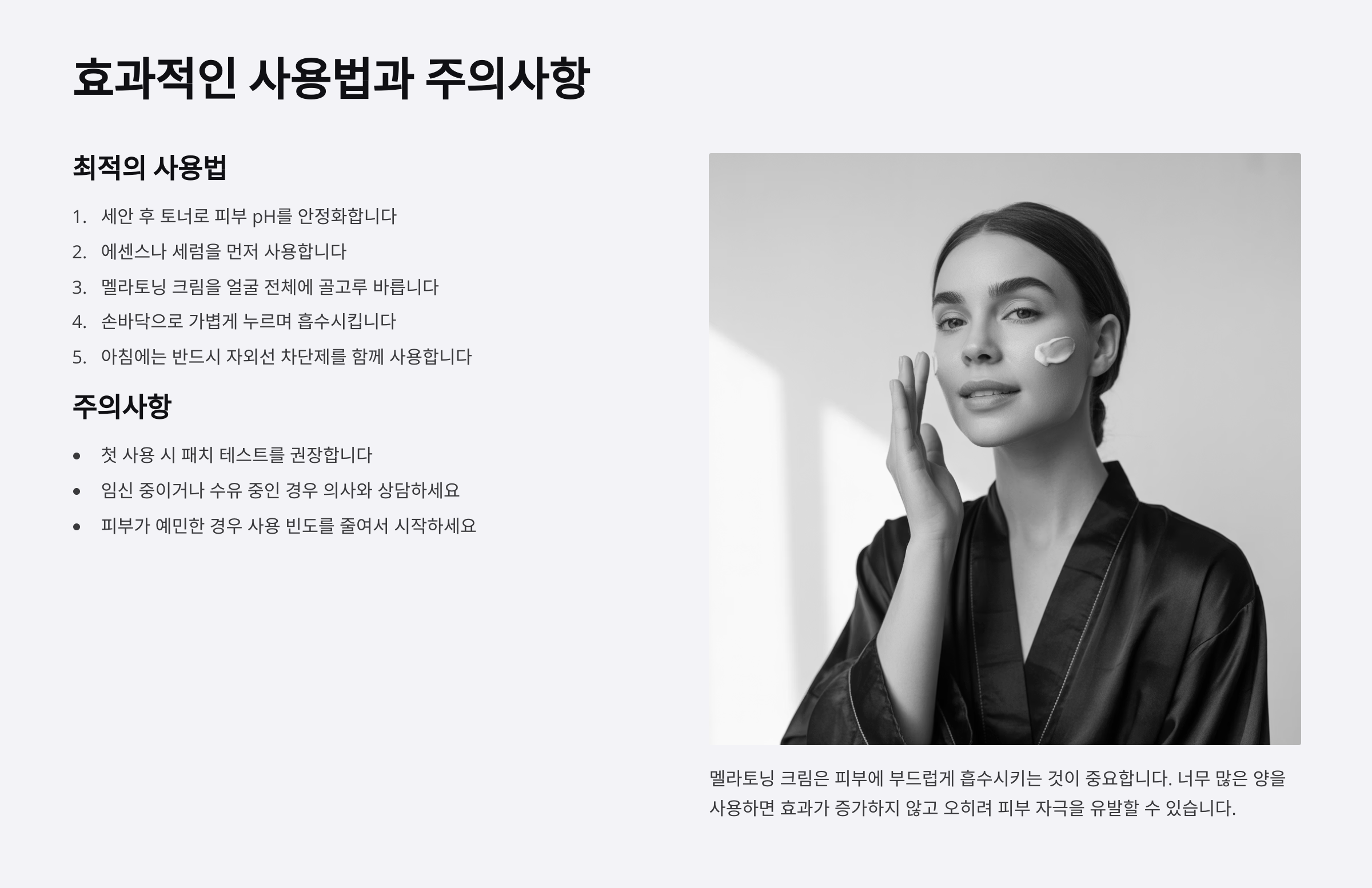 멜라토닝 크림의 효과를 극대화하려면 올바른 사용법을 따라야 해요. 먼저 세안 후 토너로 피부결을 정돈한 다음, 적당량을 덜어 얼굴 전체에 부드럽게 펴 발라주세요. 색소침착이 심한 부위에는 한 번 더 덧발라주는 것도 좋은 방법이에요. 아침과 저녁 하루 두 번 사용하는 것이 기본이지만, 민감한 피부는 저녁에만 사용하는 것부터 시작해보세요.