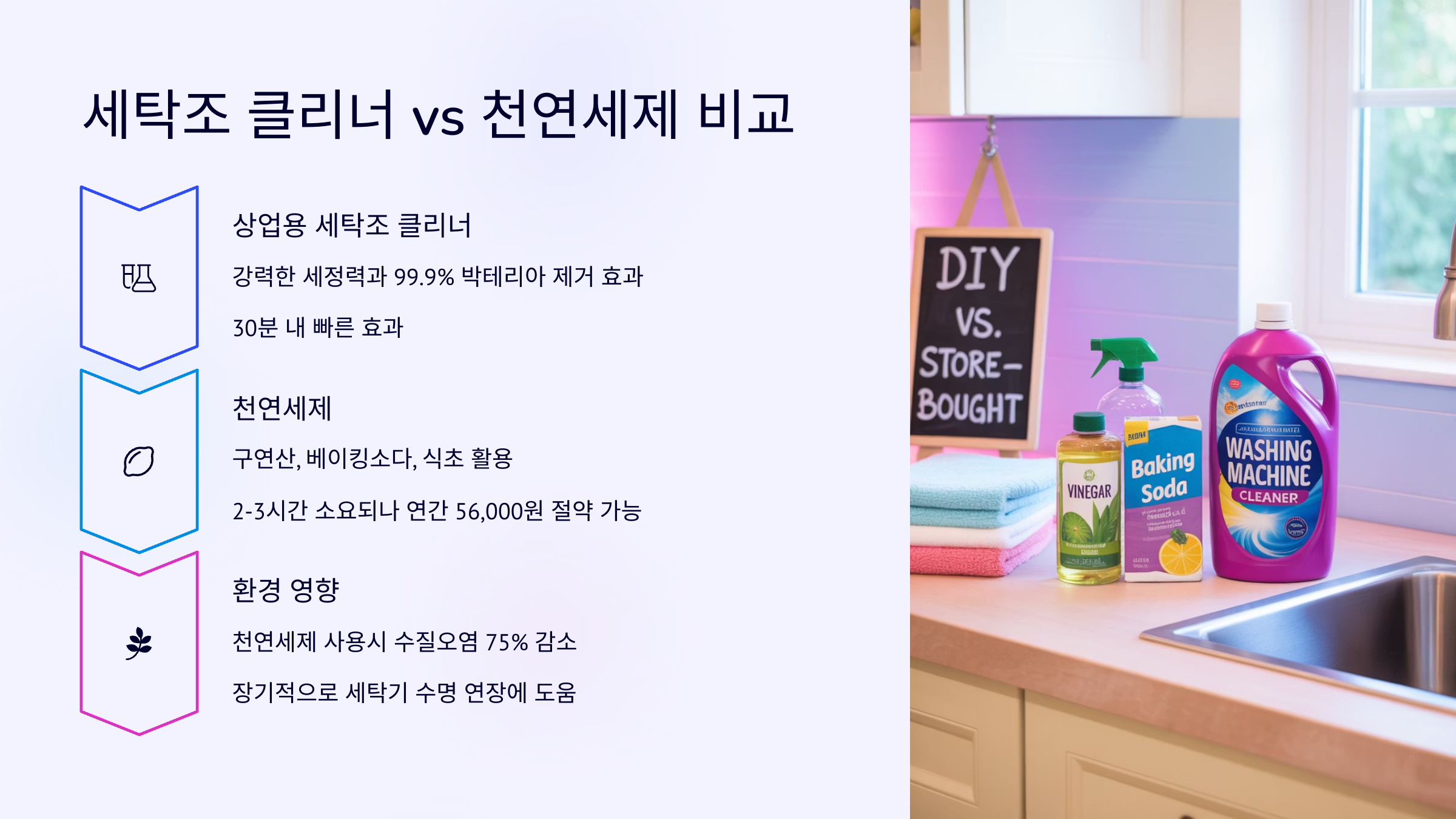 | 세탁조 클리너 | 빠른 세척, 강력한 살균 | 화학 성분 포함 | 정기적인 강력 청소용 |