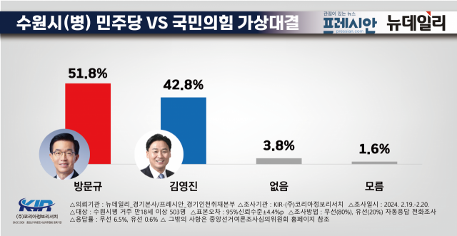 <프레시안 경기인천취재본부>와 <뉴데일리 경기취재본부>가 공동으로 KIR-㈜코리아정보리서치에 의뢰해 수원병 선거구 만 18세 이상 성인남녀 503명을 대상으로 실시한 여론조사에서 ‘수원병 국회의원으로 다음 두 후보가 맞대결한다면 누구를 지지하시겠습니까?’라는 질문에 방문규 예비후보와 김영진 예비후보는 각각 51.8%와 42.8%의 지지율을 기록했습니다.