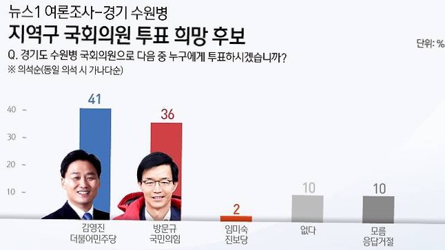 뉴스1이 여론조사 전문업체 한국갤럽에 의뢰해 지난 8~9일 경기 수원병 선거구에 거주하는 만 18세 이상 남녀 503명을 대상으로 실시해 11일 공개한 여론조사에 따르면 '내일이 국회의원 선거일이라면 누구에게 투표하겠느냐'는 질문에 김 의원은 41%, 방 전 장관은 36%의 지지율을 획득했습니다.