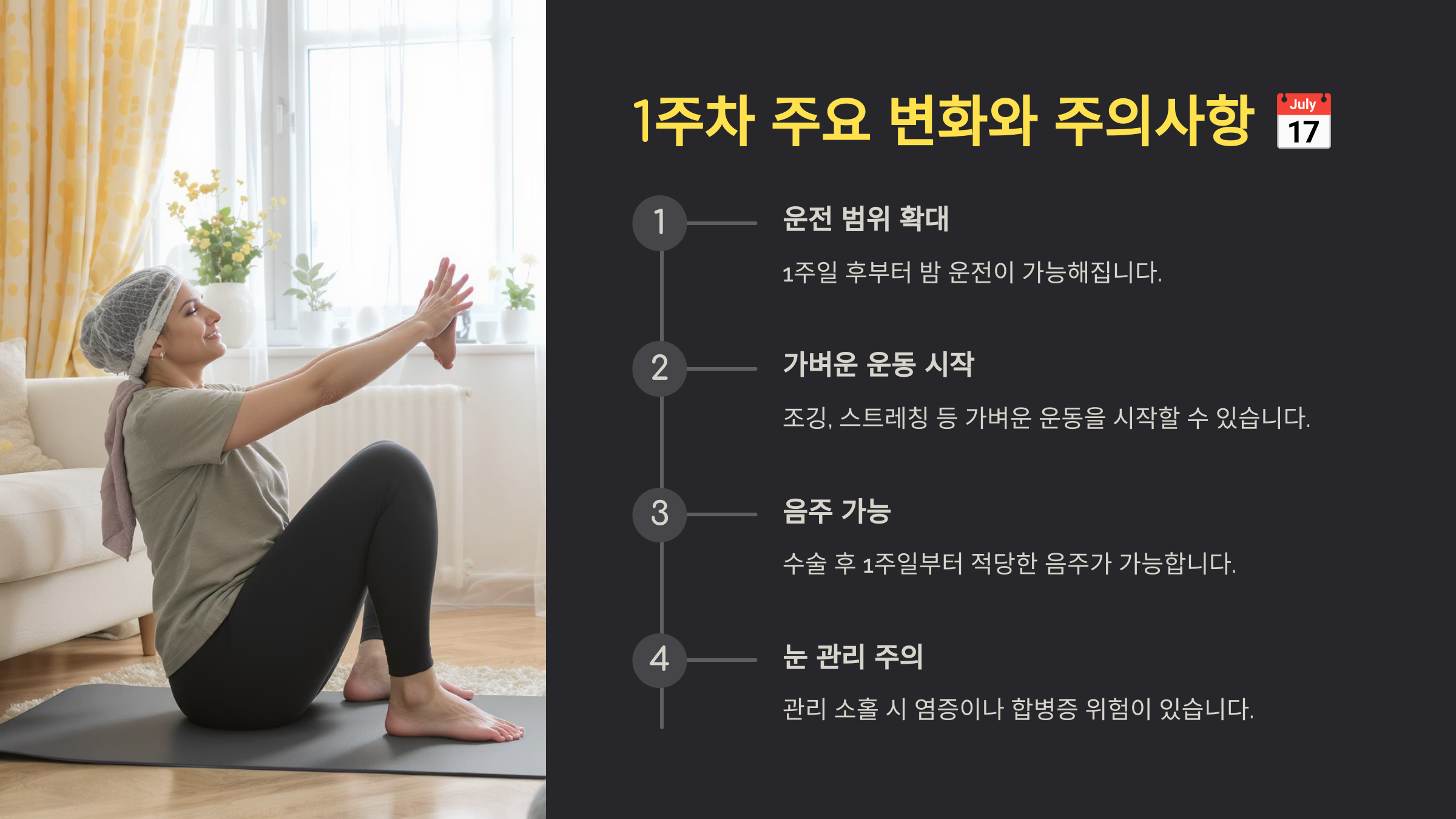 이제 다음으로 넘어가 볼게요. 수술 후 첫 주 동안 어떤 변화가 생기는지, 뭘 조심해야 하는지 정리해드릴게요! 📅