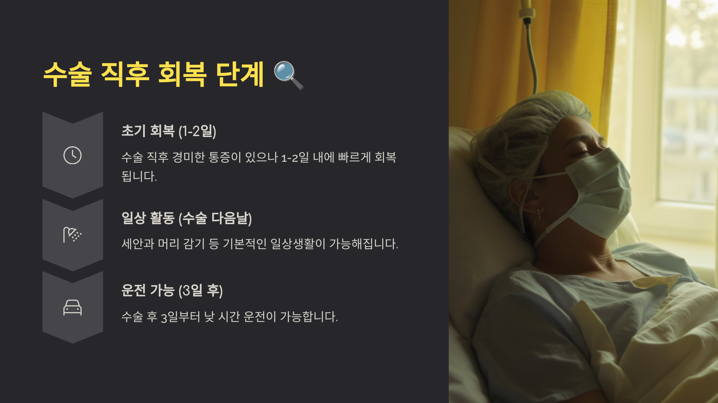 그럼 다음으로는, 스마일 라식 수술 직후 눈이 어떻게 반응하고 회복되는지 단계별로 설명해드릴게요. 회복 속도와 증상에 대해 궁금하셨죠? 지금 바로 알려드릴게요! 🔍