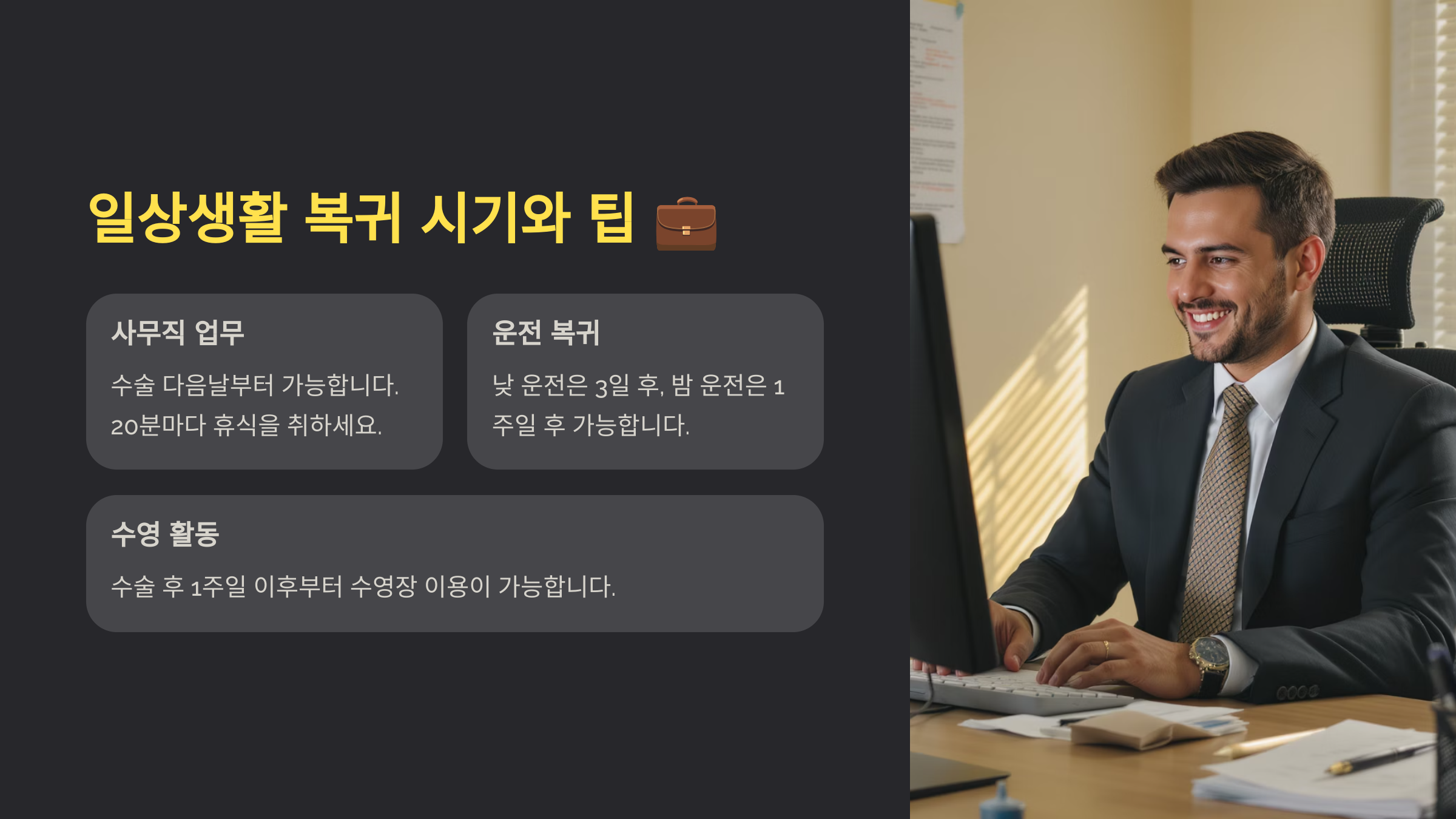 다음 섹션에서는 일상 복귀 시기와 실생활에서 유의할 점들을 알려드릴게요! 💼