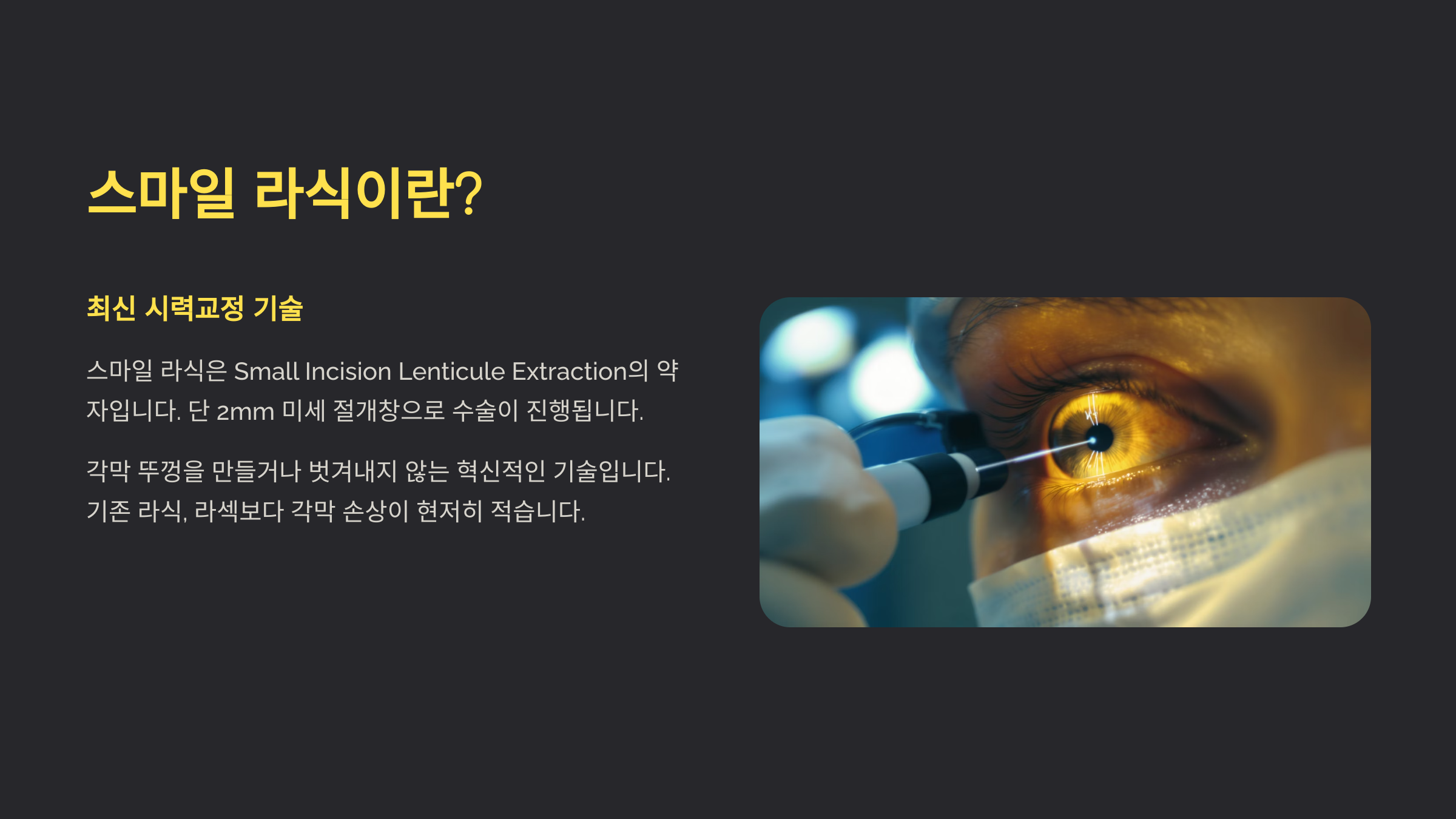 스마일 라식은 기존 라식·라섹과 달리 각막 절개 범위가 최소화된 최신 시력교정 수술이에요. 회복 속도가 빠르고 통증이 적다는 점에서 많은 사람들이 선택하는 수술 중 하나랍니다.