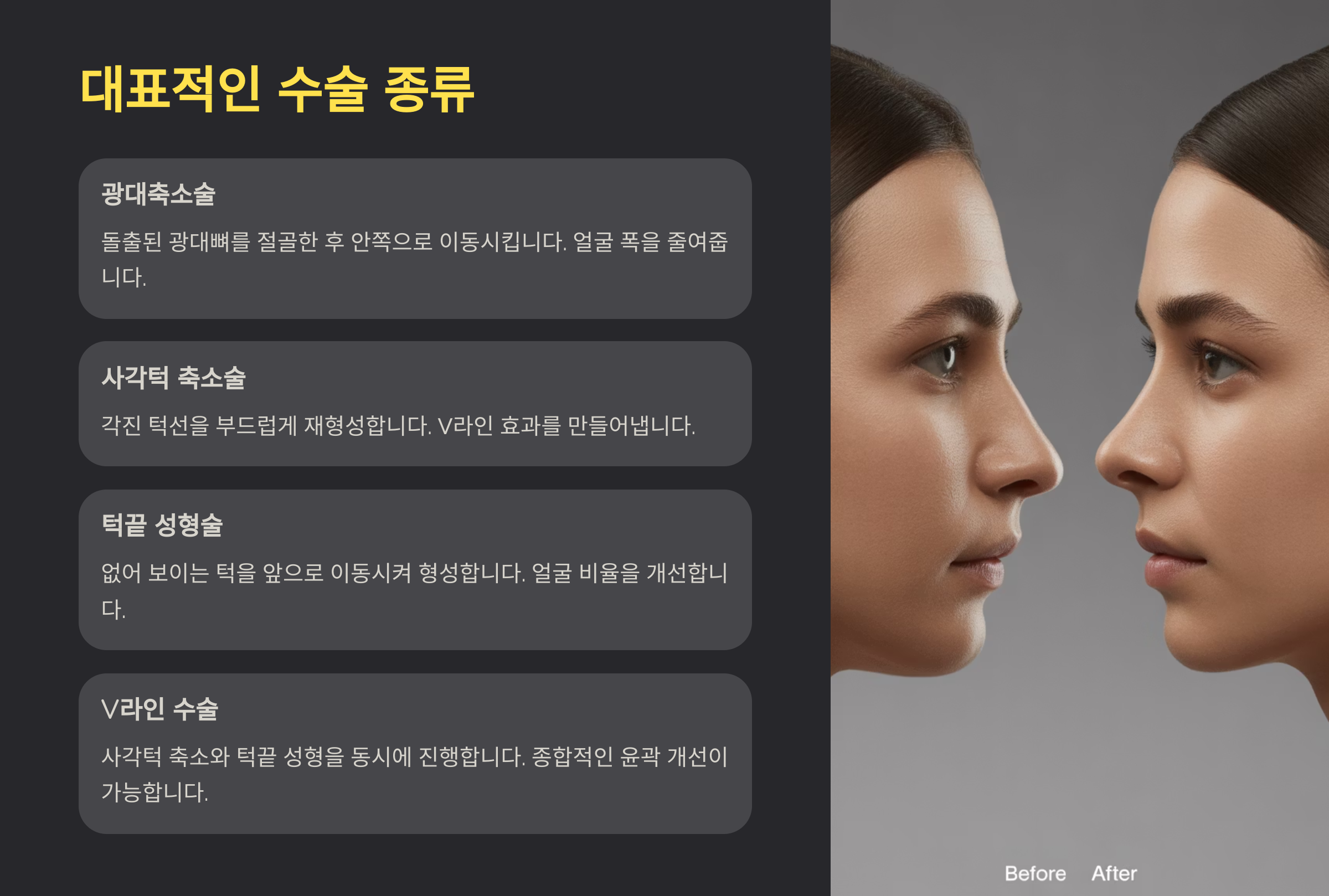 이 수술은 단순한 미용 목적뿐 아니라 비대칭 얼굴, 턱관절 통증 같은 기능적인 문제 개선에도 효과가 있어요. 수술은 고도의 기술이 필요하고 전신마취 하에 진행되기 때문에 병원 선택이 매우 중요하답니다.
