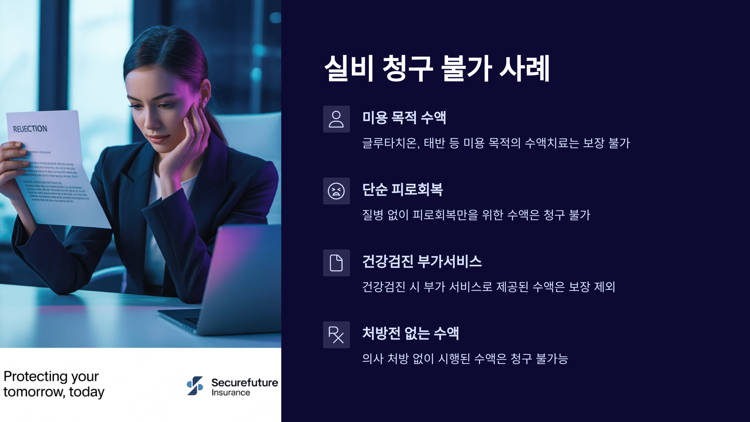 예를 들어 단순한 피로회복, 숙취해소, 미백, 피부관리 등을 목적으로 수액을 맞았을 경우에는 실비 보장이 되지 않아요. 진단서에 명확한 질병코드가 없거나, “수액요법(비급여)”로만 적힌 경우도 거절 사유예요.