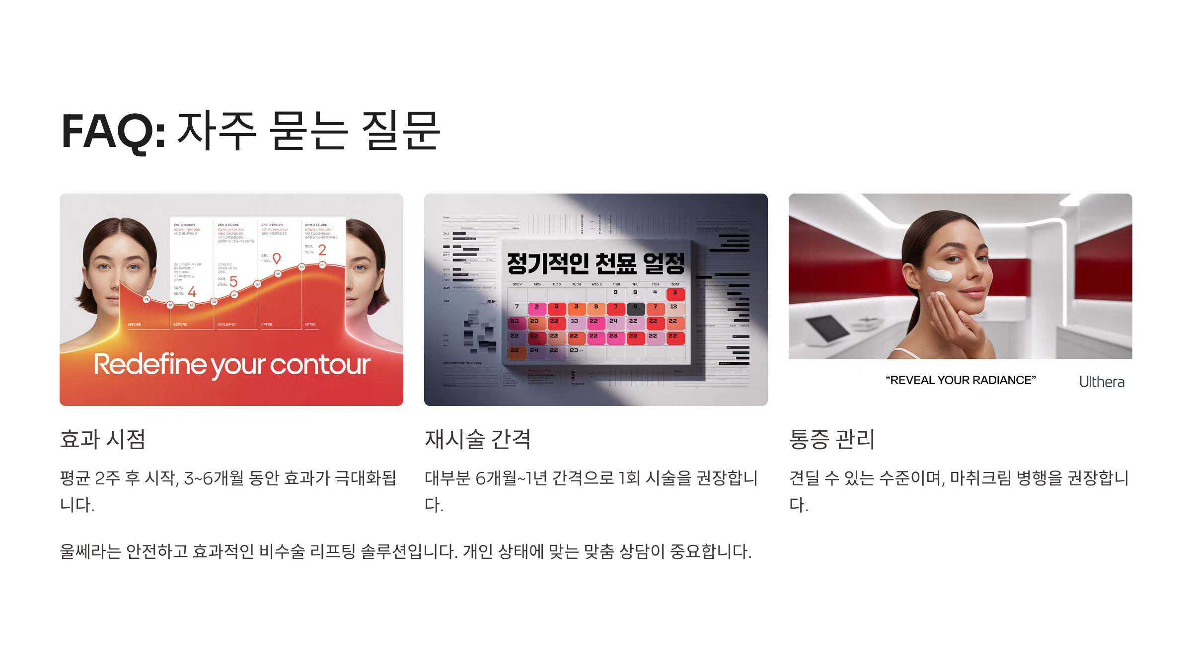 시술 시 피부 표면은 손상되지 않고 내부만 자극되기 때문에 일상 생활에 큰 지장이 없다는 것도 울쎄라의 장점이에요. 다운타임이 거의 없고, 바로 화장이 가능하다는 점이 특히 직장인들에게 인기 있는 이유 중 하나예요.
