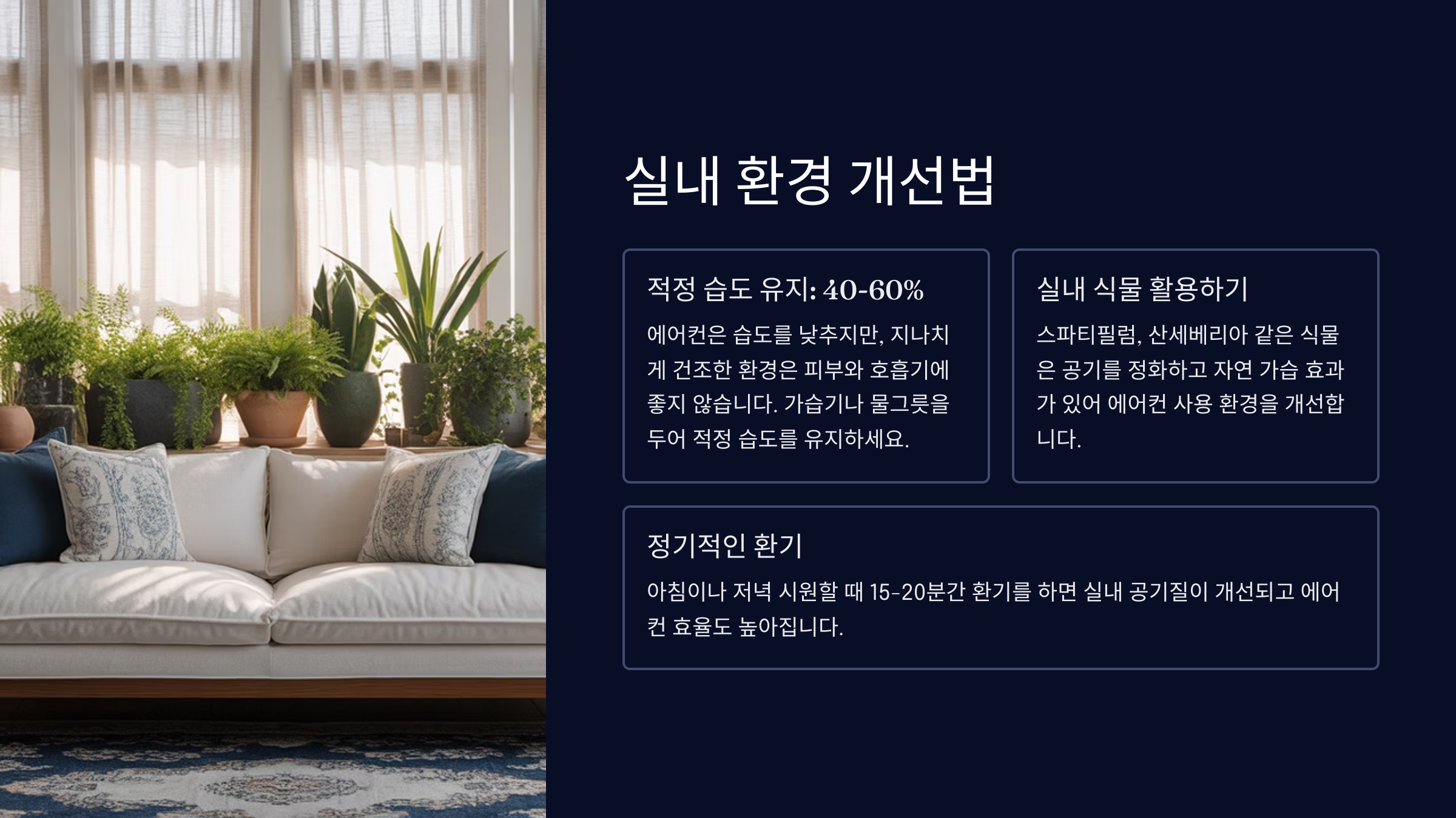 에어컨만으로는 한계가 있어요. 실내 환경을 개선하면 에어컨 효율이 훨씬 높아져요! 가장 중요한 것은 단열이에요. 창문으로 들어오는 열이 전체 열의 70%를 차지한다는 사실 알고 계셨나요? 암막 커튼이나 블라인드를 설치하면 실내 온도를 2-3도 낮출 수 있어요.