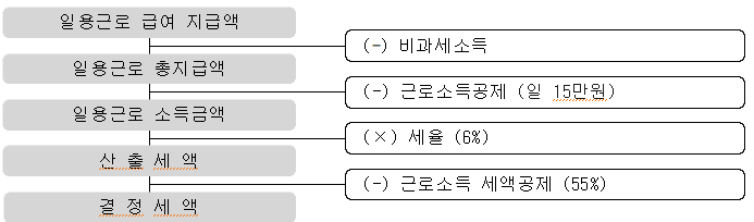 ![]() * 결정세액이 1,000원 미만인 경우 소액부징수로 소득세를 원천징수하지 않음 * 일당 일용근로 총지급액이 137천원(결정세액 999원) 이하인 경우 소액부징수 * 1일 2이상 사업장에서 일용근로 제공시 세액계산은 사업장별로 계산하여 소액부징수 판단 |