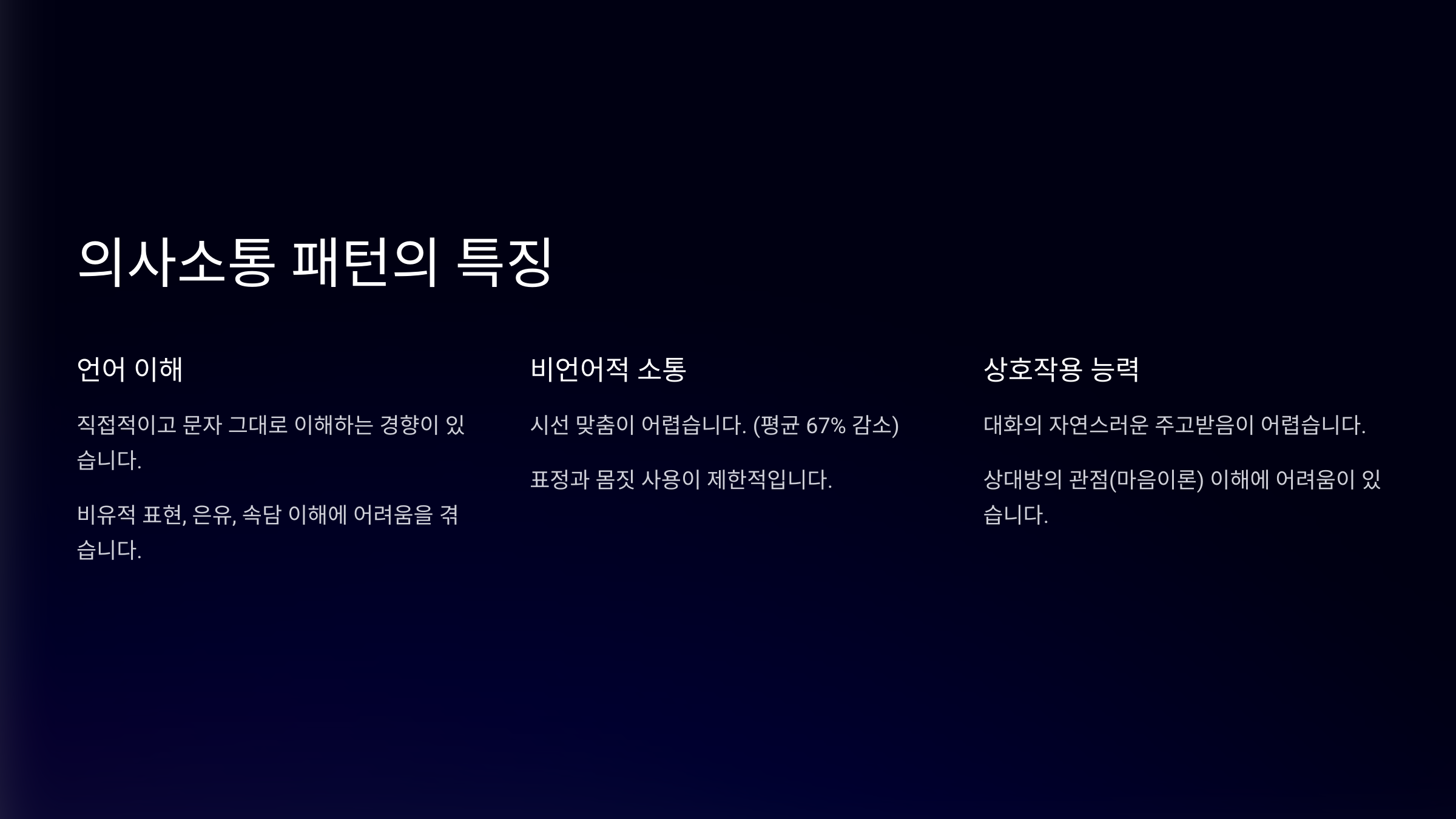 - 눈 맞춤이나 얼굴 표정 사용에 제약이 있음