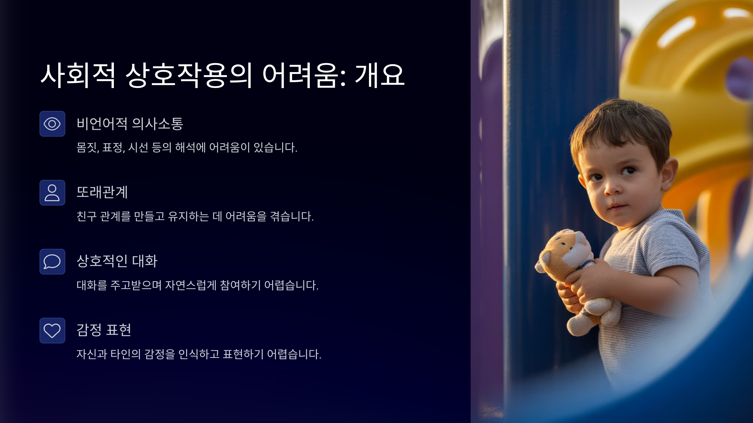 - 말 대신 그림 카드나 제스처로 의사소통 시도 📇