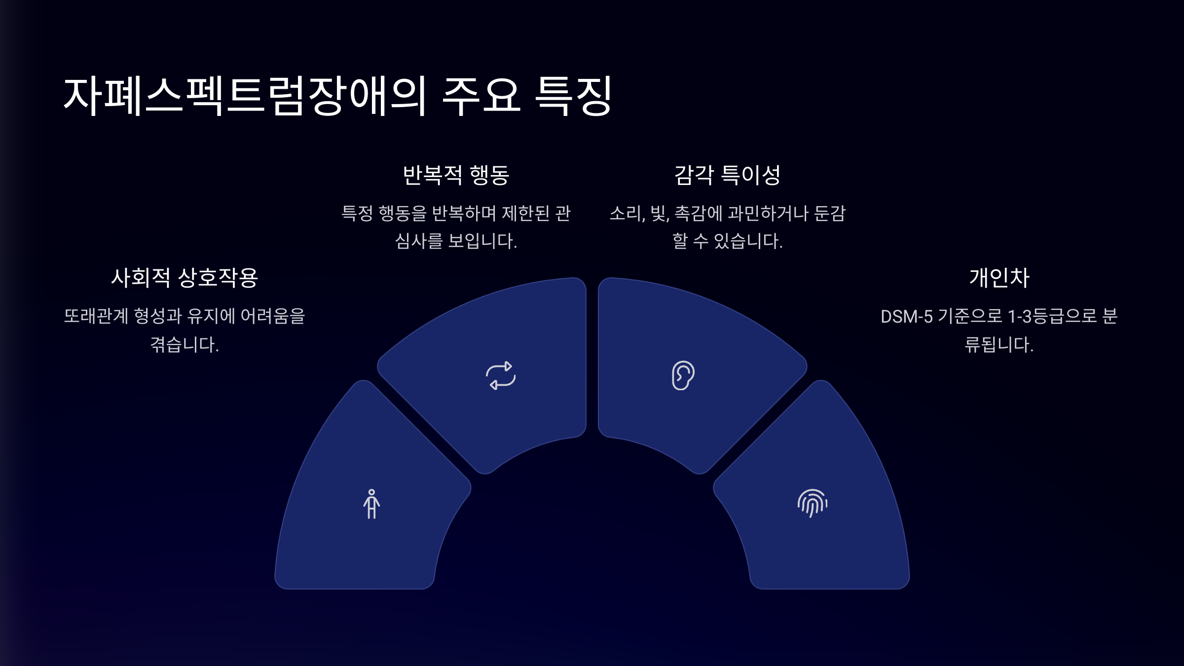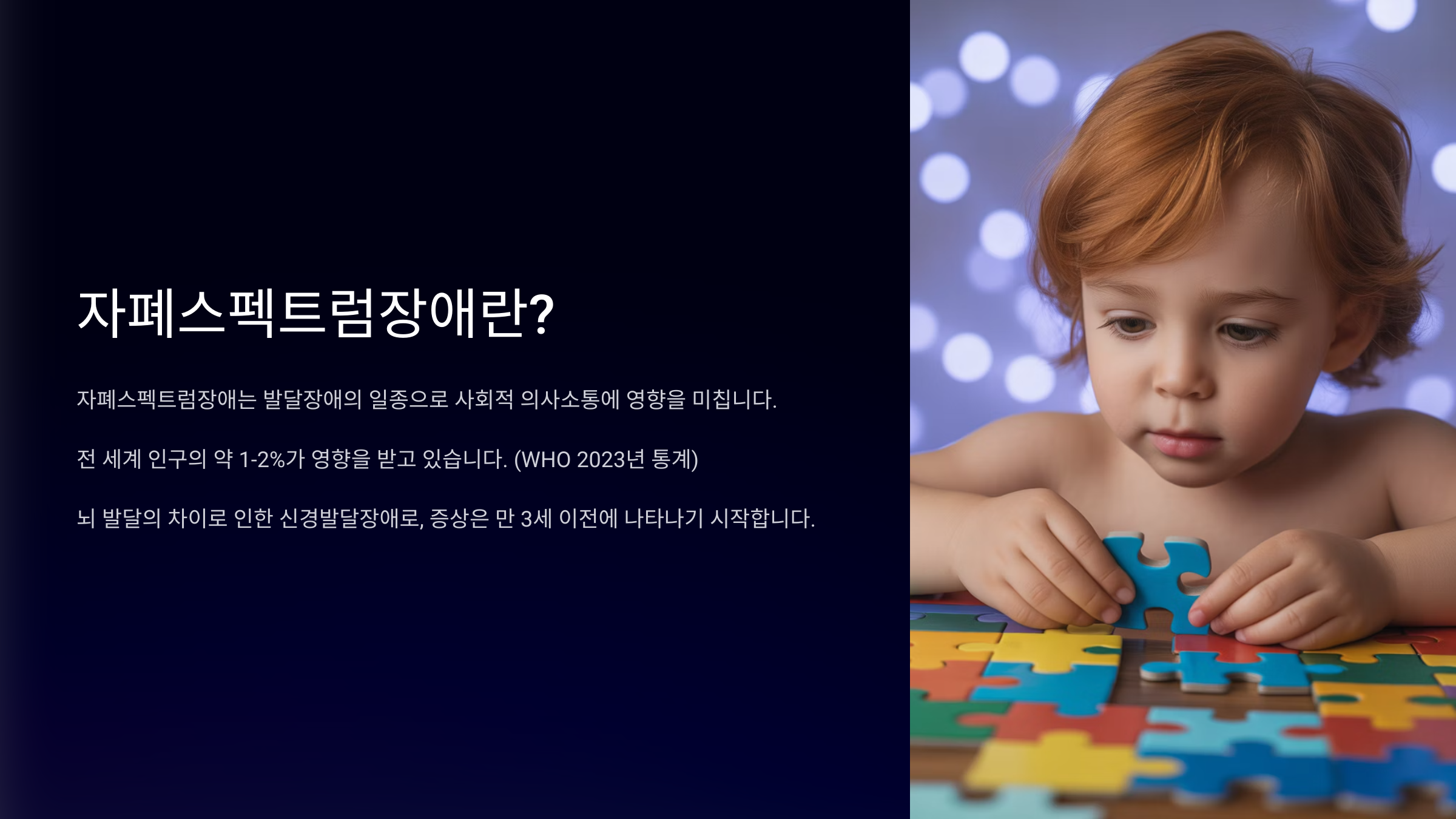 자폐 스펙트럼 장애(Autism Spectrum Disorder, ASD)는 다양한 행동적, 사회적, 의사소통적 특징을 동반하는 신경 발달 장애입니다. 개인마다 증상의 정도나 형태가 매우 다양하게 나타나며, 조기 발견과 적절한 중재가 무엇보다 중요합니다.