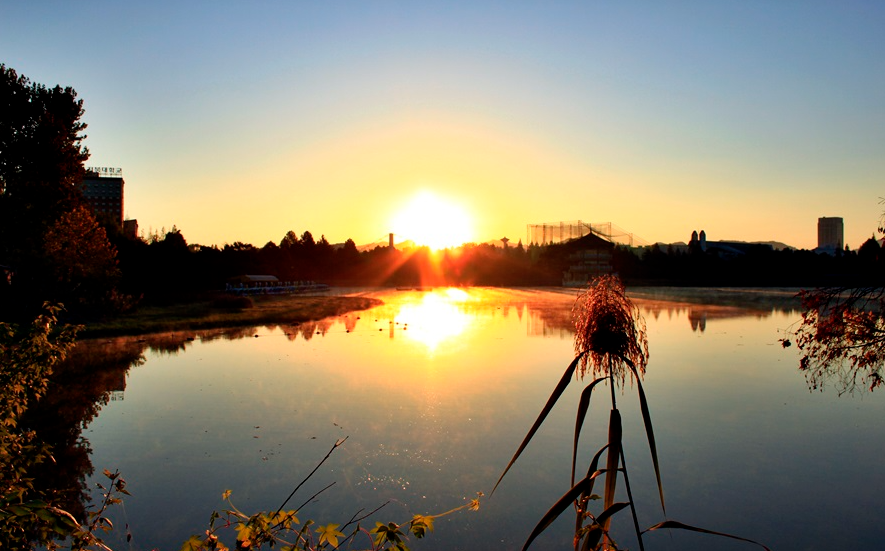 덕진공원의 넓은 호수 위로 떠오르는 해는 평화롭고 고요한 분위기를 제공합니다.