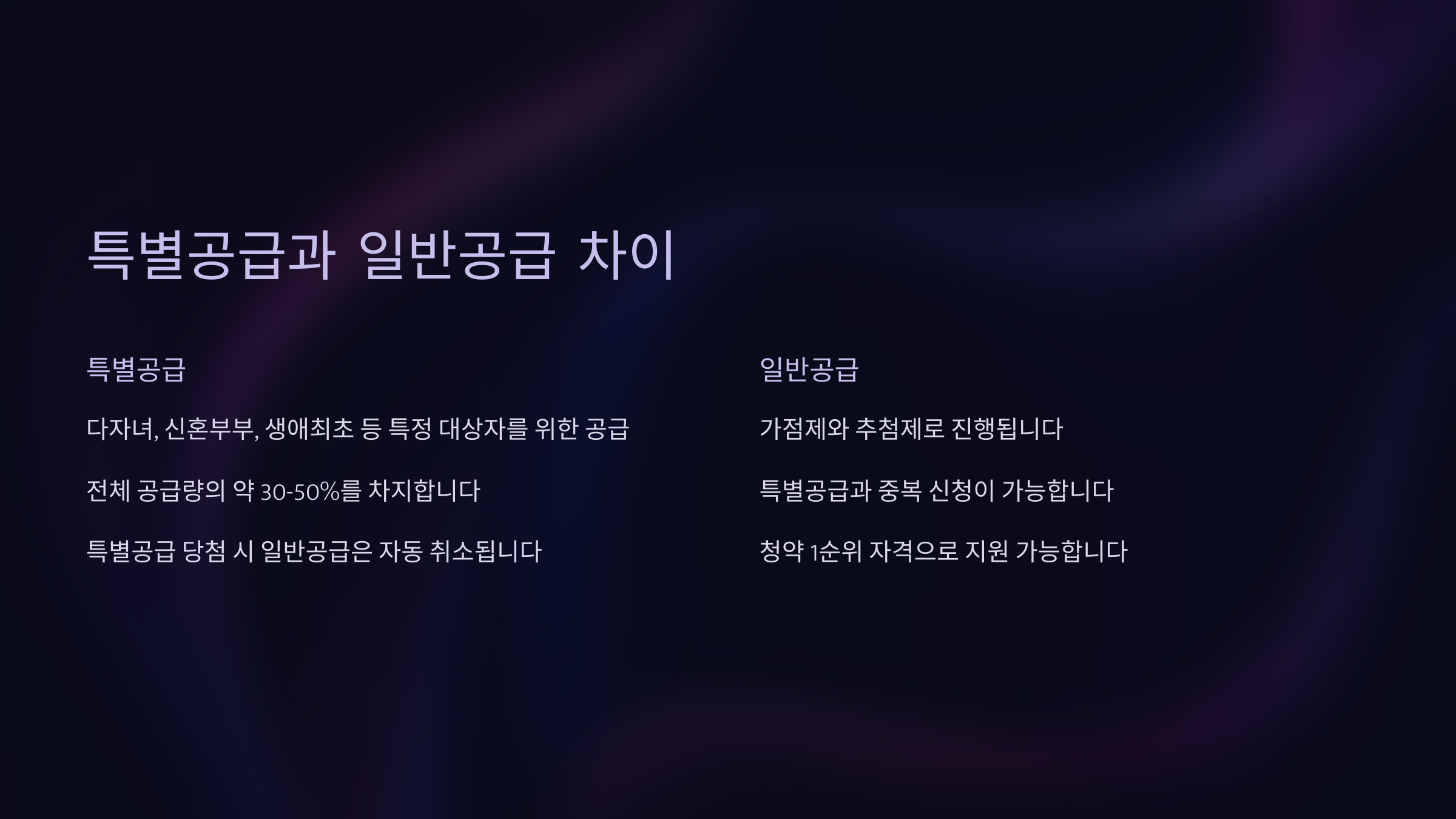 특별공급은 경쟁률이 낮은 대신 자격요건이 까다로울 수 있어요. 조건만 맞춘다면 일반공급보다 훨씬 유리한 구조이니, 본인이 해당되는 유형이 있는지 꼭 확인해보는 걸 추천해요.