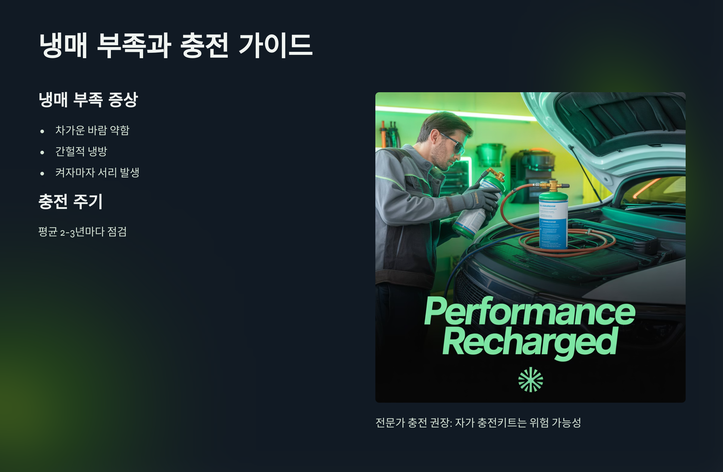 | R-134a | 1995~현재 | 가장 보편적, 안정적 | 5-8만원 |