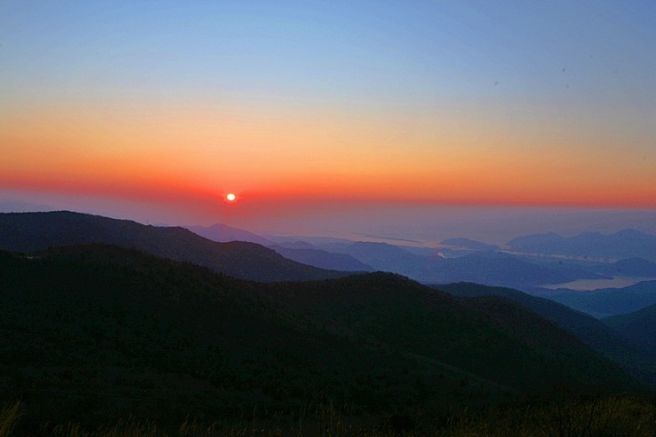 산 정상의 고요한 분위기와 함께 떠오르는 태양은 감동적입니다.