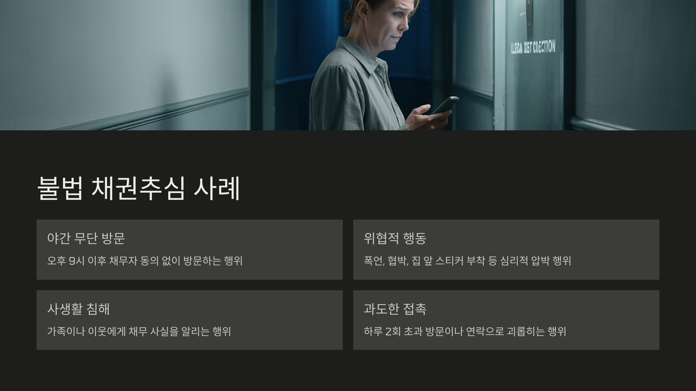 자택 방문을 포함한 모든 추심행위는 '공포감 유발', '사생활 침해', '과도한 반복성'이 있으면 위법 소지가 매우 높아지니 주의가 필요해요.