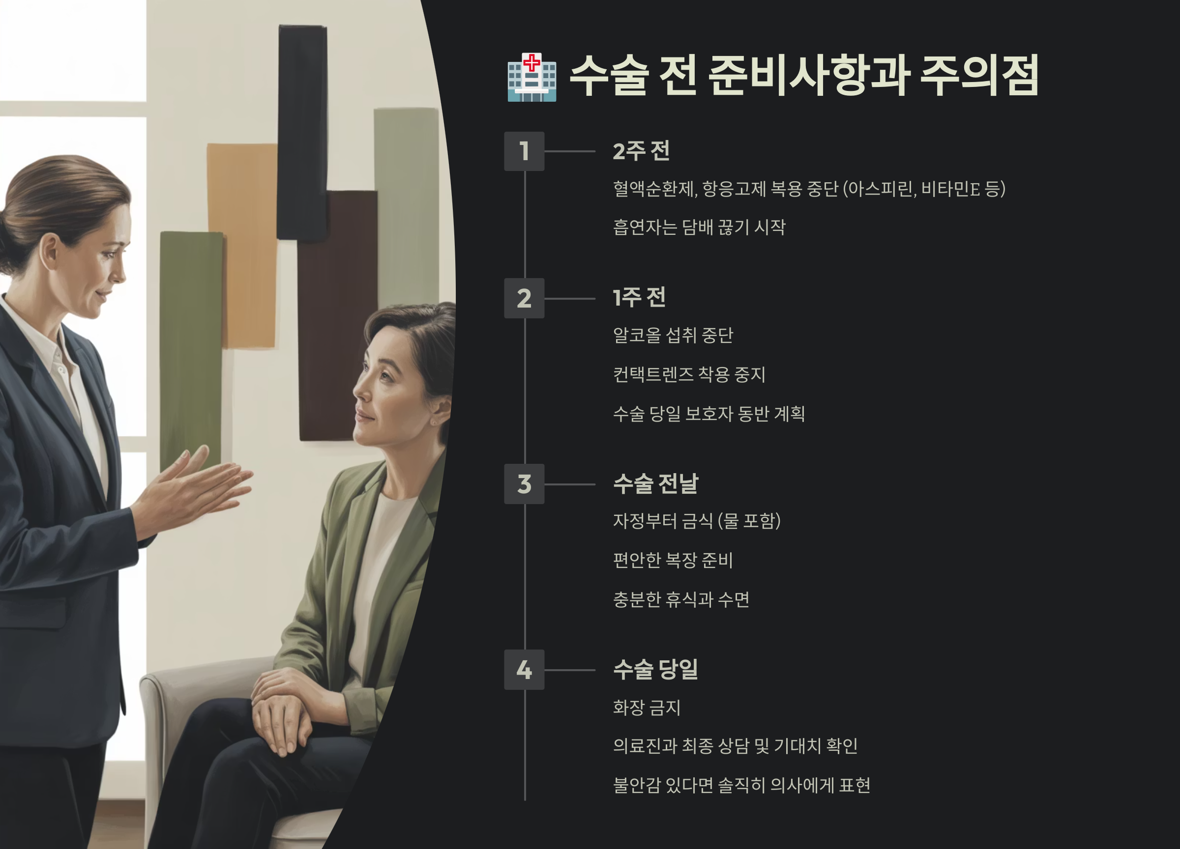 수술 당일 준비도 꼼꼼히 해야 해요. 전신마취를 한다면 최소 8시간 전부터 금식해야 하고, 부분마취라도 가벼운 식사만 하는 것이 좋아요. 렌즈는 빼고 안경을 준비하고, 편안한 옷을 입고 가세요. 귀걸이나 목걸이 같은 액세서리는 모두 빼고 가는 것이 좋아요.