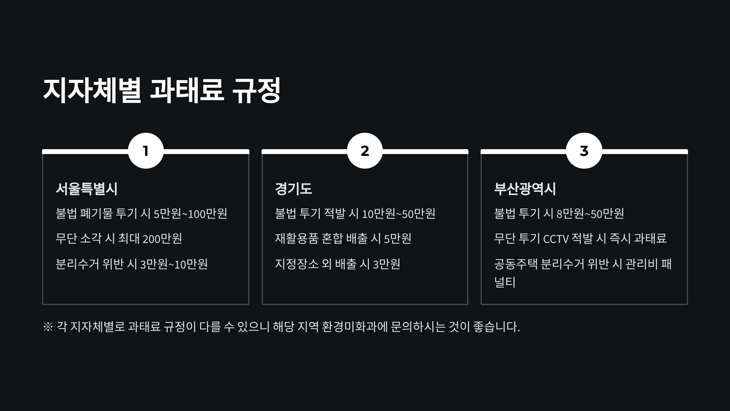 과태료 부과 기준도 지역마다 달라요. 어떤 지역은 경고 후 과태료를 부과하지만, 어떤 지역은 즉시 과태료를 부과해요. 상습 위반자는 형사고발까지 당할 수 있어요. 폐기물관리법 위반으로 벌금형을 받으면 전과자가 될 수도 있으니 정말 주의해야 해요.