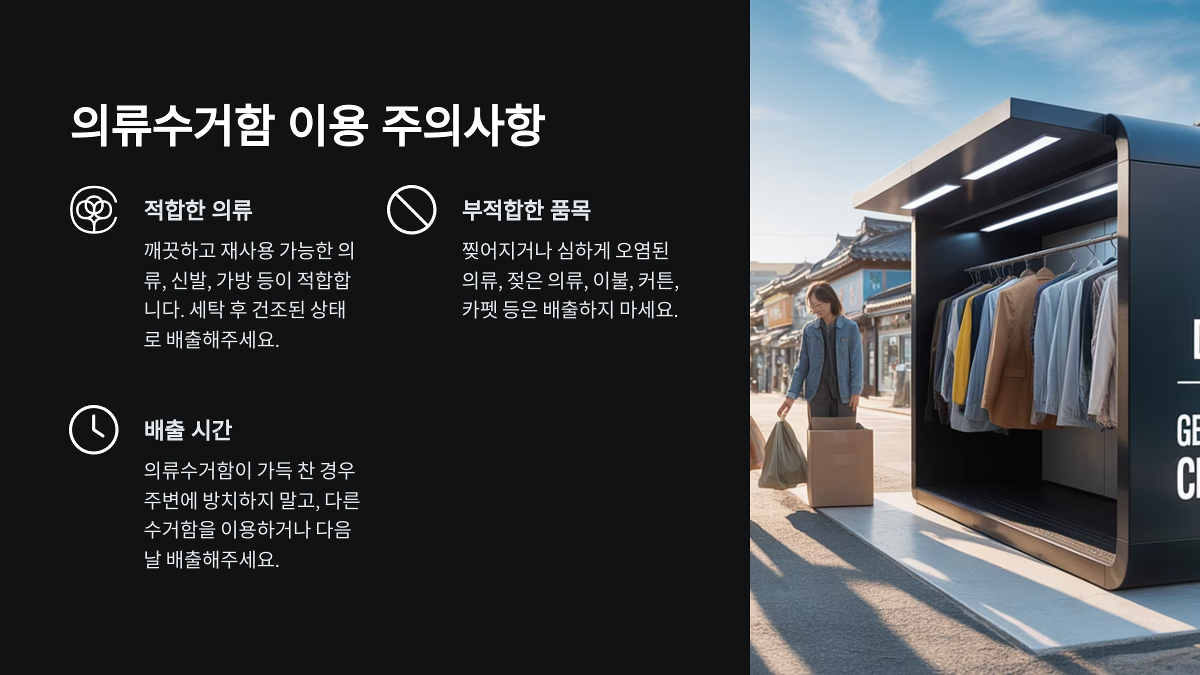 의류수거함을 이용할 때는 깨끗한 상태로 넣어야 해요. 더러운 옷이나 이불은 재활용이 안 돼요. 세탁하고 완전히 말린 후에 비닐봉투에 담아서 넣는 것이 좋아요. 젖은 상태로 넣으면 곰팡이가 생겨서 다른 의류까지 오염시킬 수 있어요.