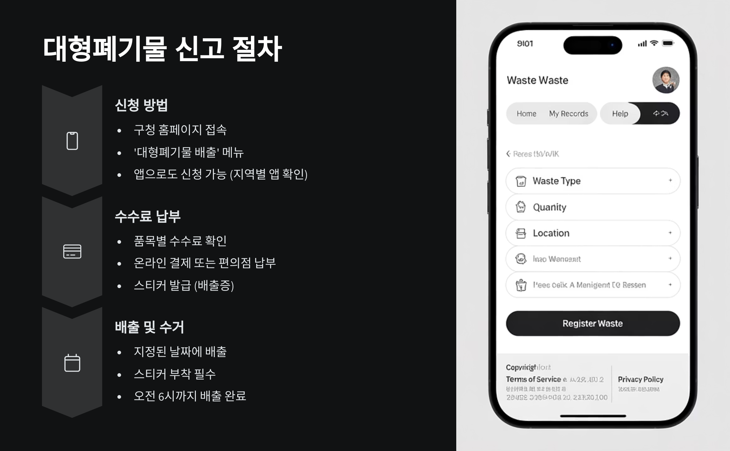 배출 장소와 시간도 중요해요. 대부분 저녁 8시 이후에 집 앞이나 지정된 장소에 놓으면 돼요. 아파트는 별도의 대형폐기물 보관소가 있는 경우가 많아요. 비가 올 때는 비닐로 잘 싸서 스티커가 떨어지지 않게 해야 해요. 스티커가 없거나 훼손되면 수거하지 않아요.