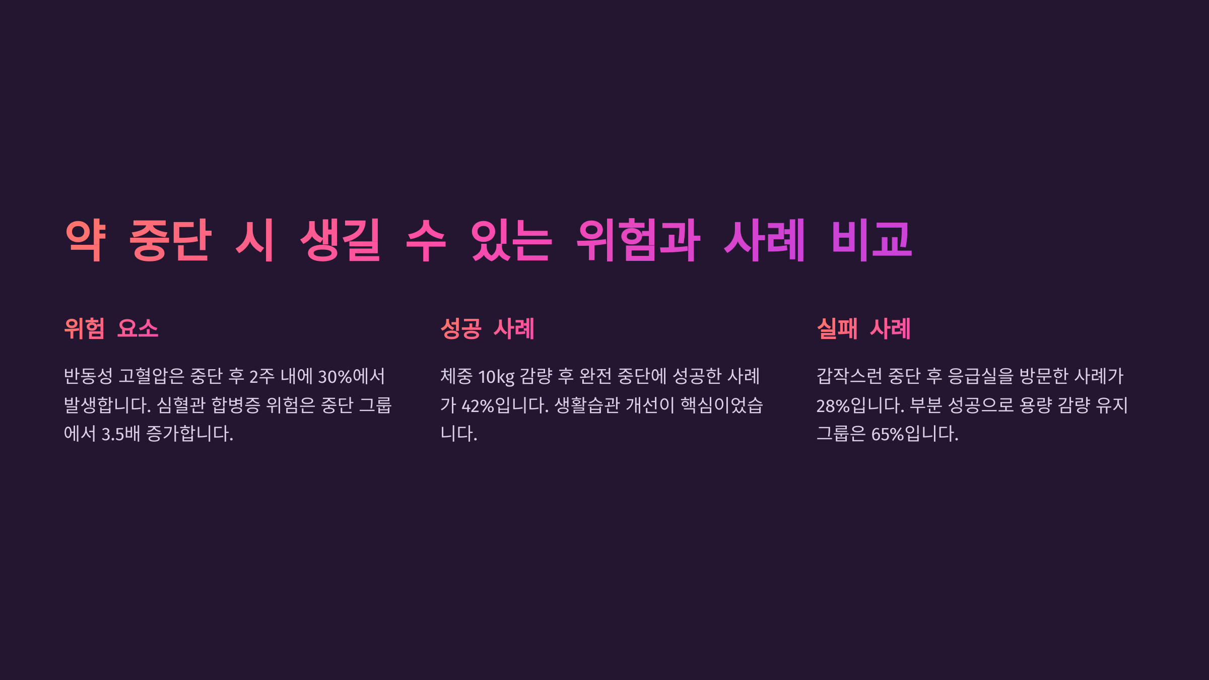 | 중단 방식 | 단계적 감량 | 갑작스러운 중단 |