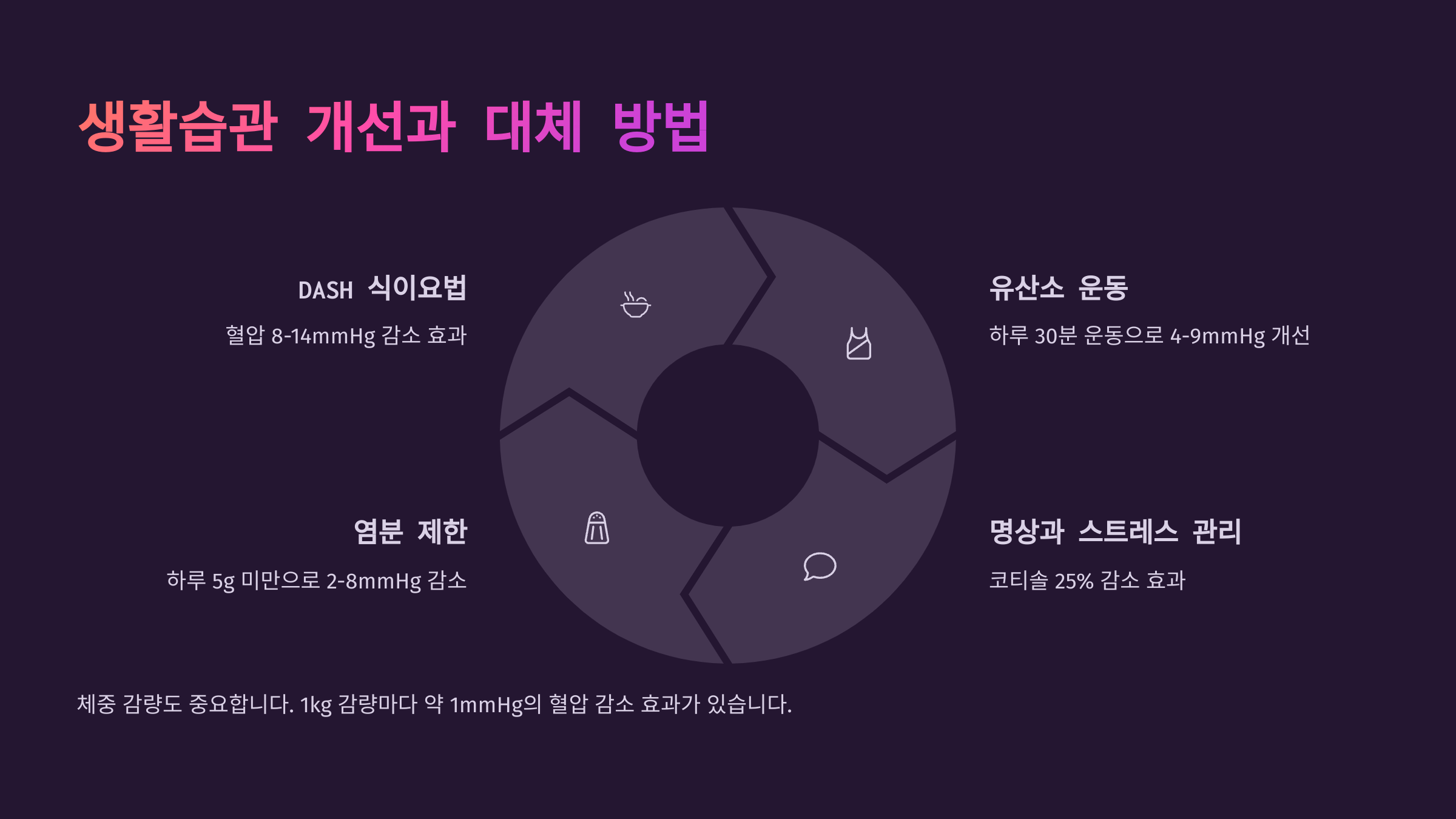 두 번째는 생활습관이에요. 규칙적인 운동, 나트륨 섭취 제한, 음주·흡연 금지, 스트레스 관리 등 혈압에 영향을 주는 모든 요인을 안정적으로 관리하고 있어야 해요. 특히 체중을 5~10% 감량한 경우는 효과가 더 좋아요.