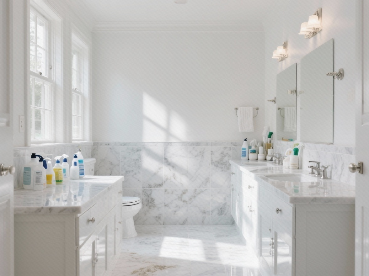 다만 한 가지 주의할 점이 있습니다. 식초는 강한 산성이기 때문에 대리석이나 석회암 같은 천연석 타일에 사용하면 표면을 부식시켜 손상시킬 수 있습니다. 따라서 천연석 자재가 있는 화장실이라면 사용을 피하거나, 눈에 띄지 않는 곳에 미리 테스트를 해보는 것이 안전합니다. 일반적인 자기질 타일이나 도기에는 안심하고 사용하셔도 좋습니다.