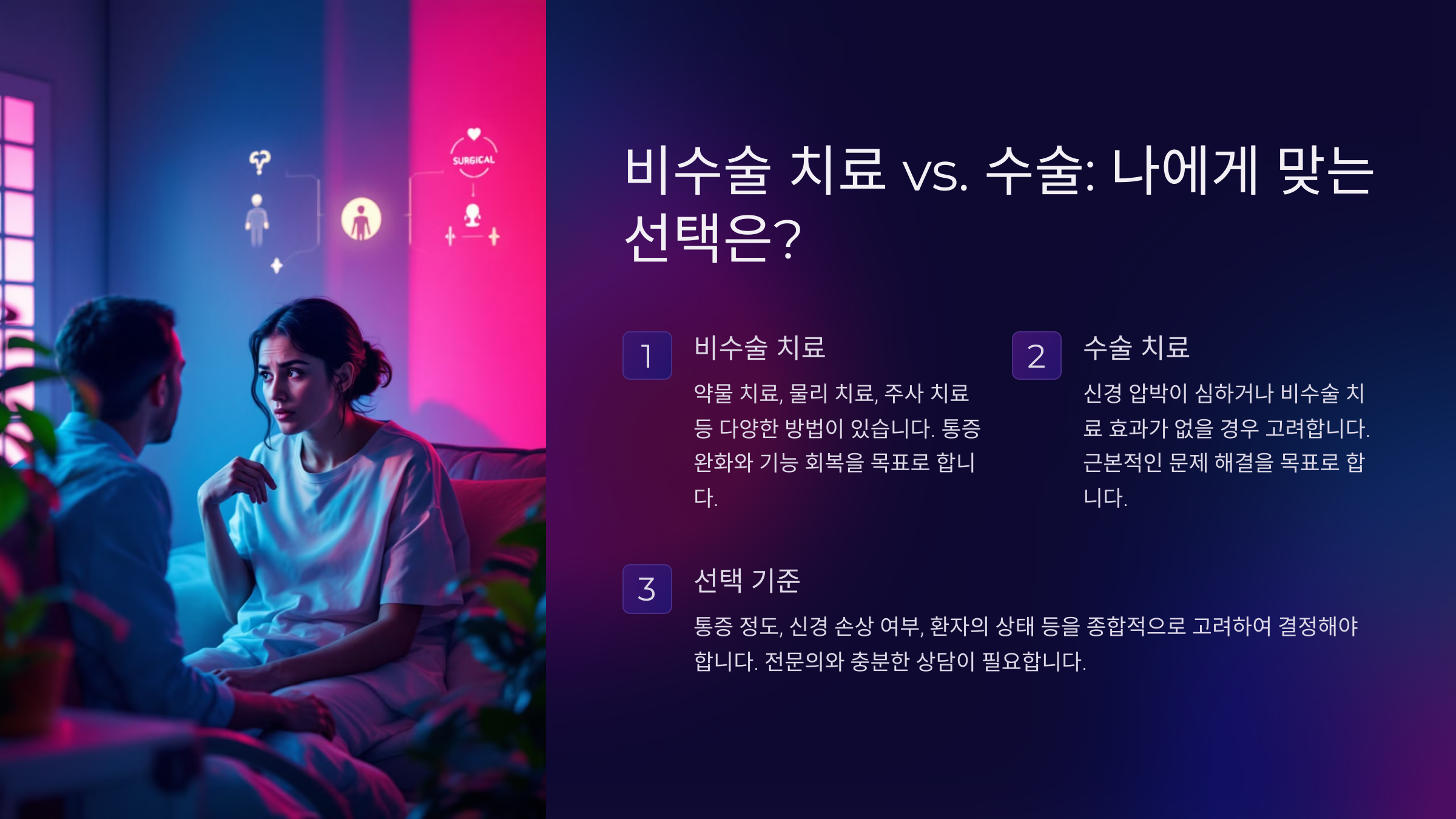 | 수술 치료 | 즉각적인 통증 완화 가능 | 회복 기간 필요, 후유증 가능 | 비수술 치료 효과 없는 경우, 마비 증상 심한 경우 |
