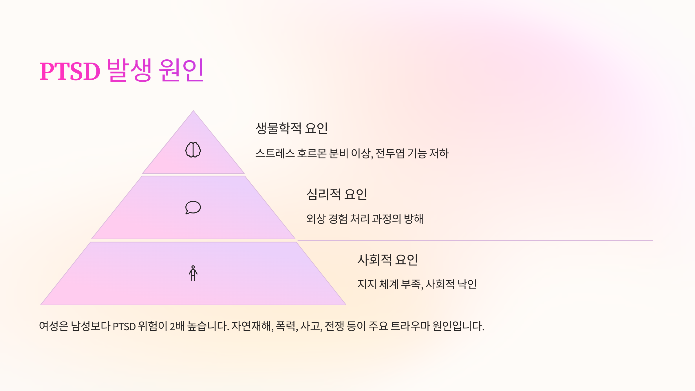 🧠 PTSD는 단지 외부 사건 때문만이 아니라, 그 사람의 전반적인 인생과 환경이 만들어낸 결과일 수 있어요. 그래서 비난보다는 이해와 지지가 더 필요해요.