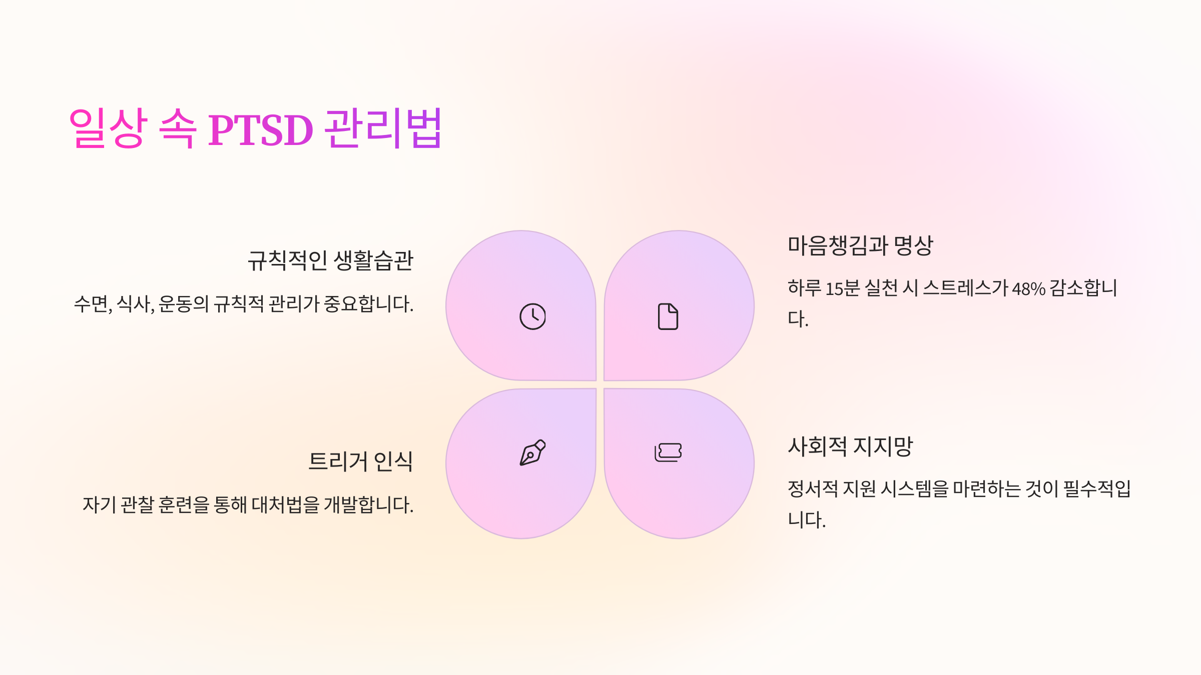 💬 PTSD 관리법은 ‘거창한 것’보다는 ‘작지만 꾸준한 습관’이에요. 천천히, 하지만 확실하게 나아가는 게 중요하답니다.