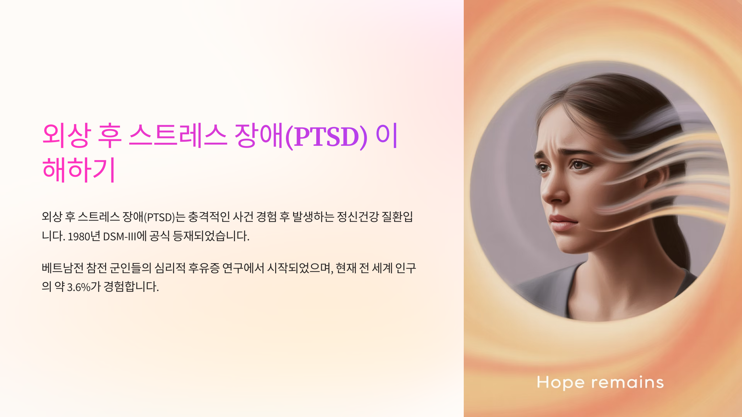 이제부터 PTSD의 정의부터 원인, 증상, 그리고 우리가 일상 속에서 할 수 있는 관리법까지 하나씩 자세히 알아보면서, 이 질환을 좀 더 가깝고 이해하기 쉽게 풀어볼게요.